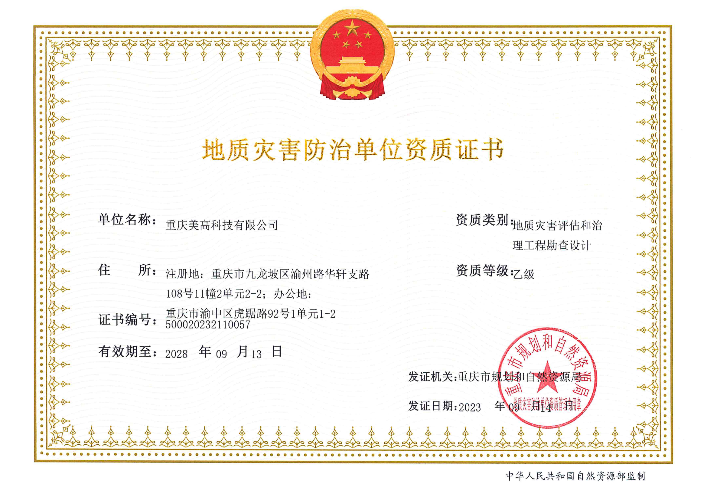 2023年9月14日,重庆美高科技有限公司顺利取得重庆市规划和自然资源局核发的地质灾害防治单位乙级资质。资质类别包括:地质灾害评估和治理工程勘查设计资质;地质灾害治理工程监理资质。资质证书如下: