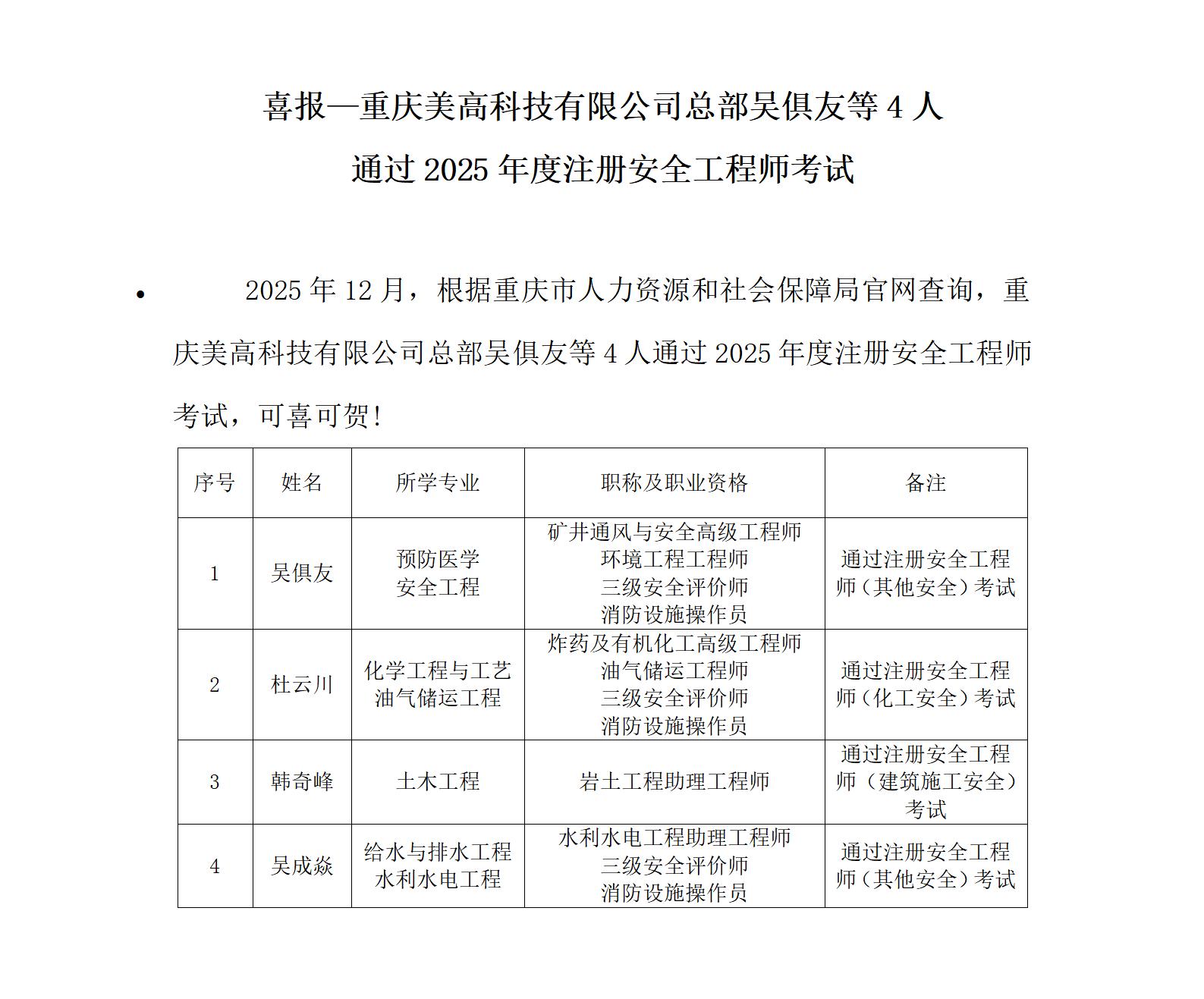 喜报-美高公司总部吴俱友等4人通过2025年度注册安全工程师考试