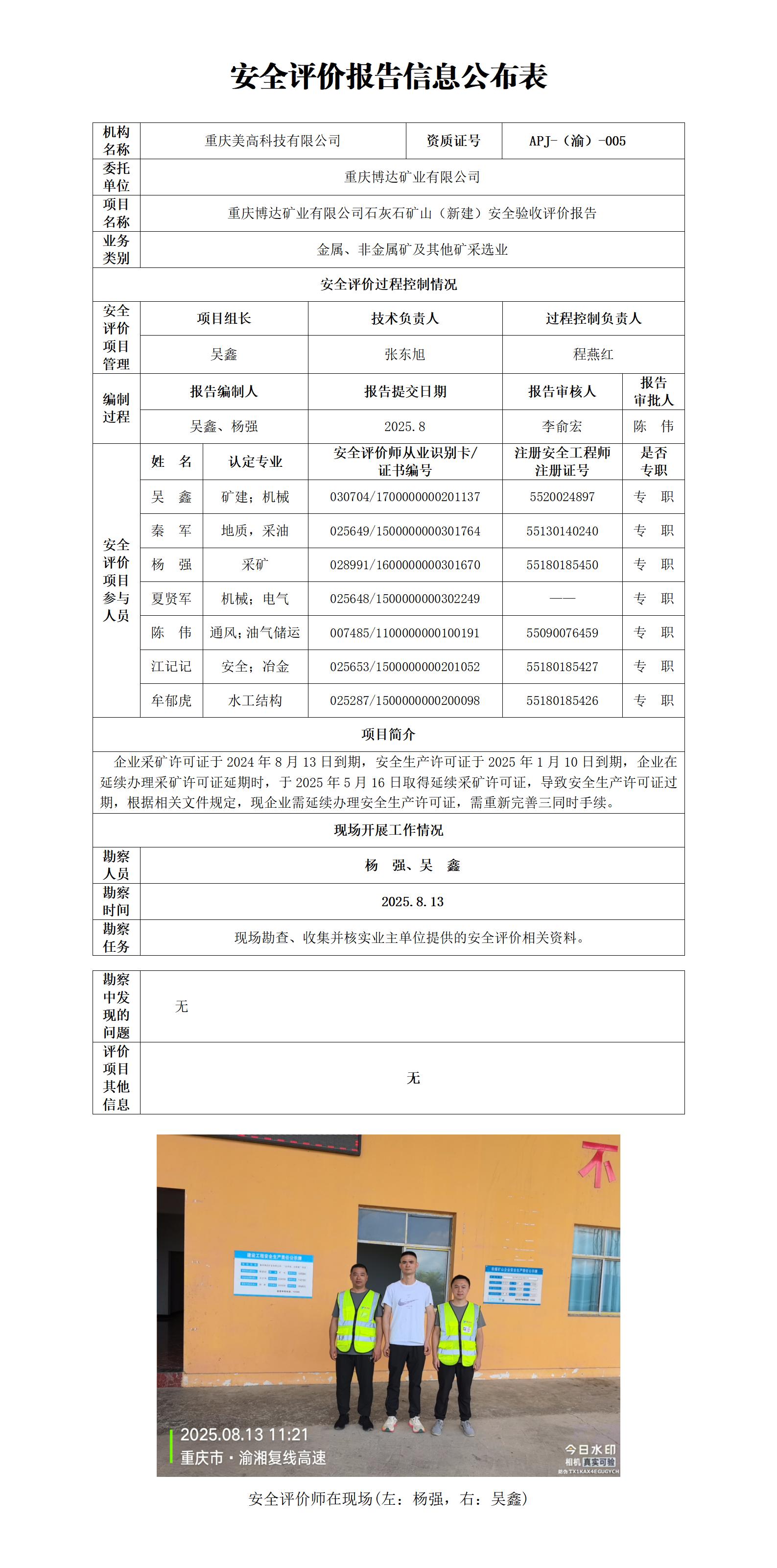 2025年3季度-重庆博达矿业有限公司石灰岩矿山(新建)安全验收评价