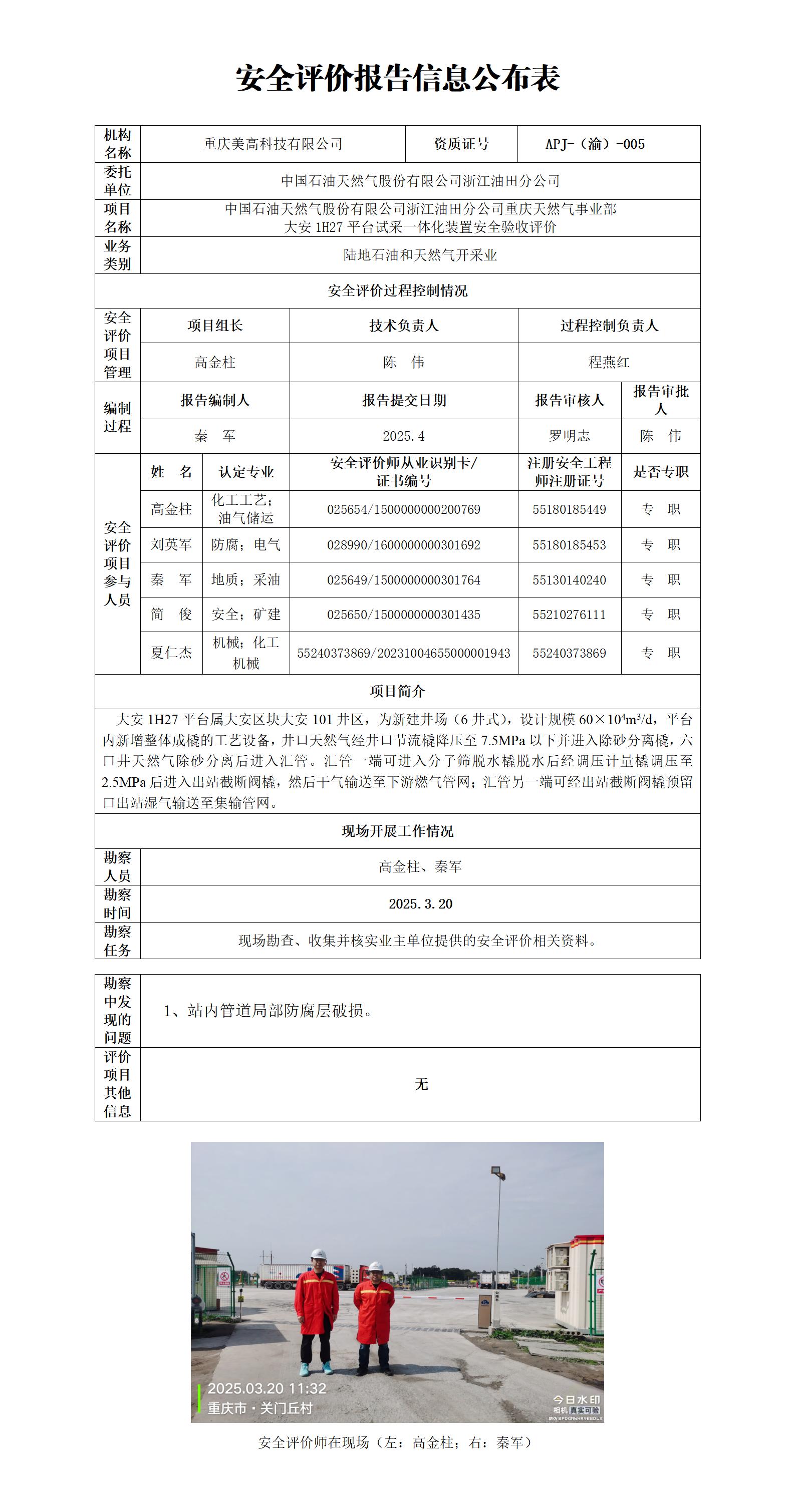 2025年2季度-中国石油天然气股份有限公司浙江油田分公司重庆天然气事业部大安1H27平台试采一体化装置安全验收评价