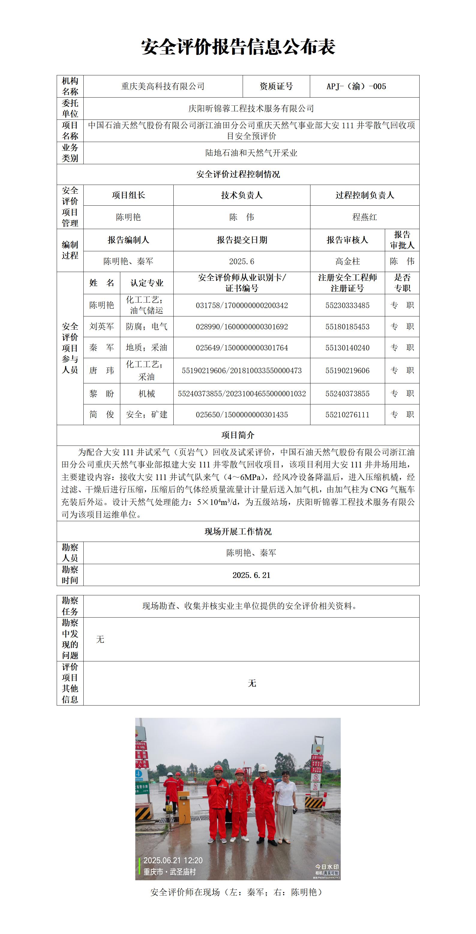 2025年2季度-中国石油天然气股份有限公司浙江油田分公司重庆天然气事业部大安111井零散气回收项目安全预评价