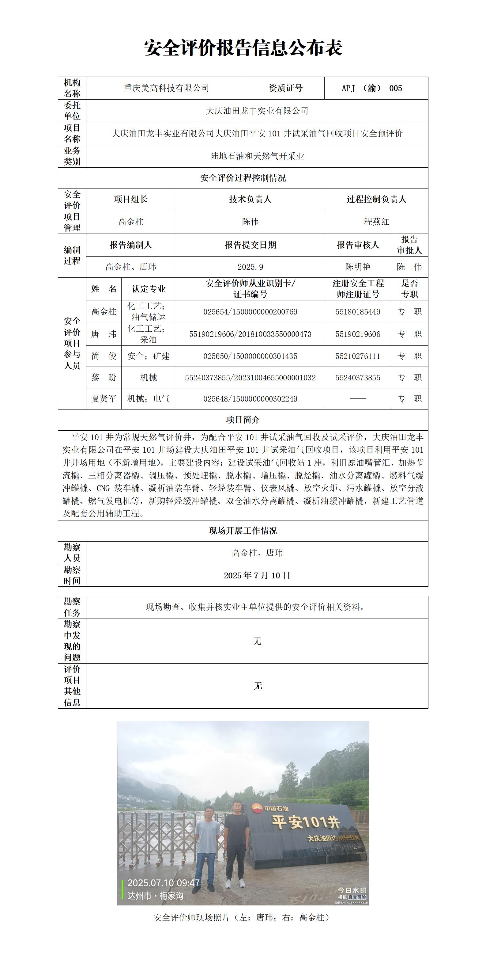 2025年3季度-大庆油田龙丰实业有限公司大庆油田平安101井试采油气回收项目安全预评价