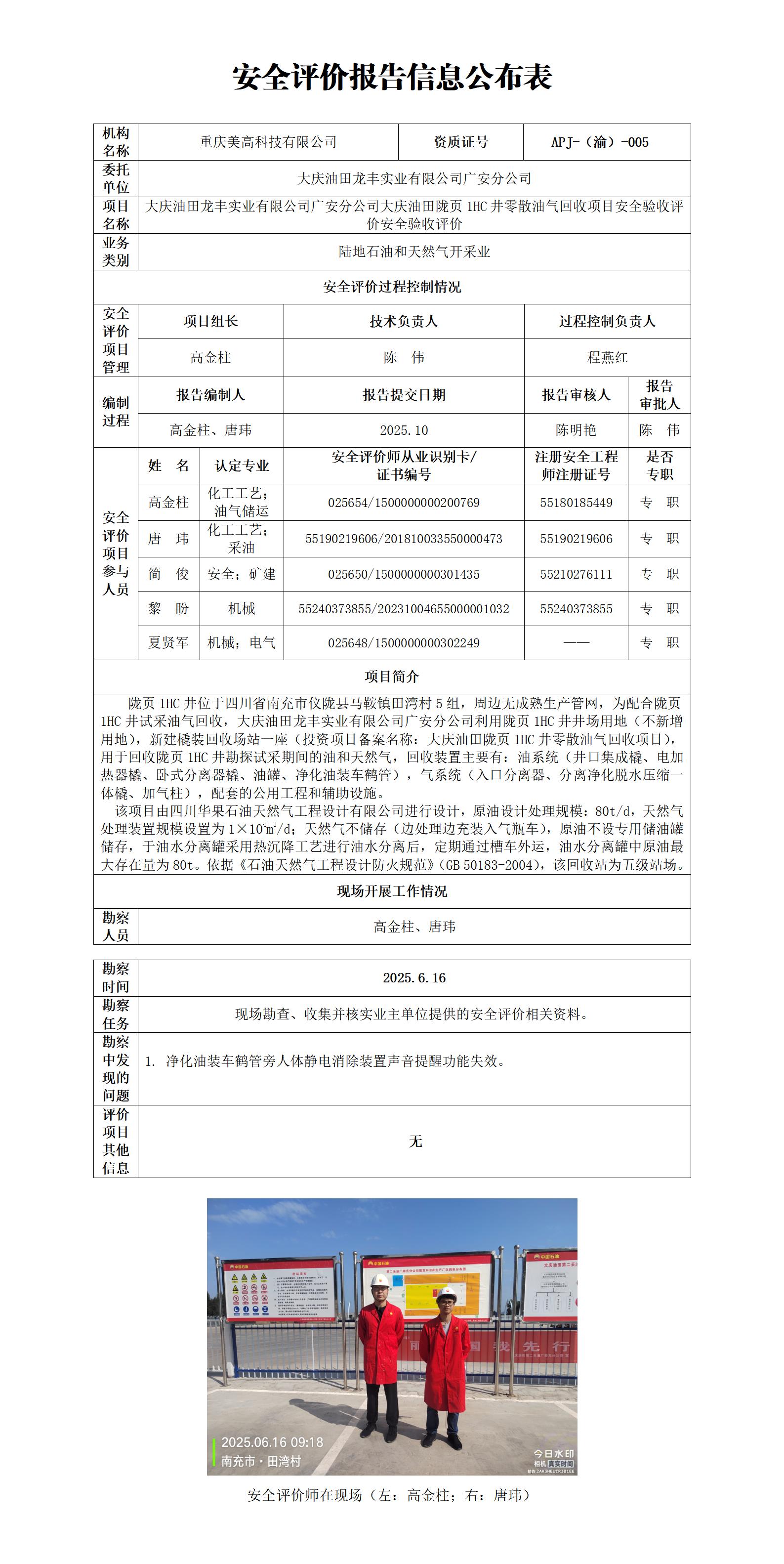 2025年4季度-大庆油田龙丰实业有限公司广安分公司大庆油田陇页1HC井零散油气回收项目安全验收评价