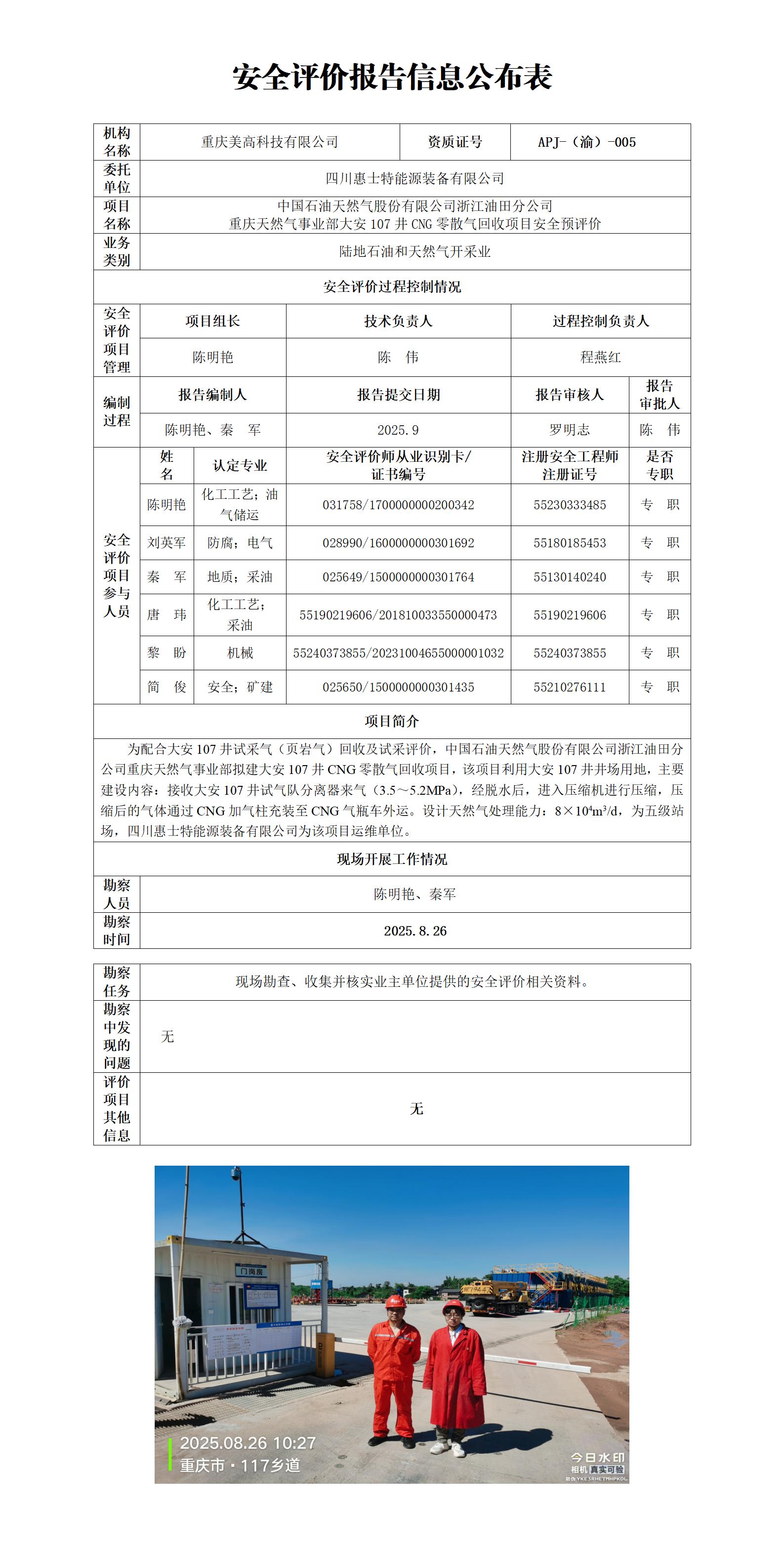 2025年3季度-中国石油天然气股份有限公司浙江油田分公司重庆天然气事业部大安107井CNG零散气回收项目安全预评价