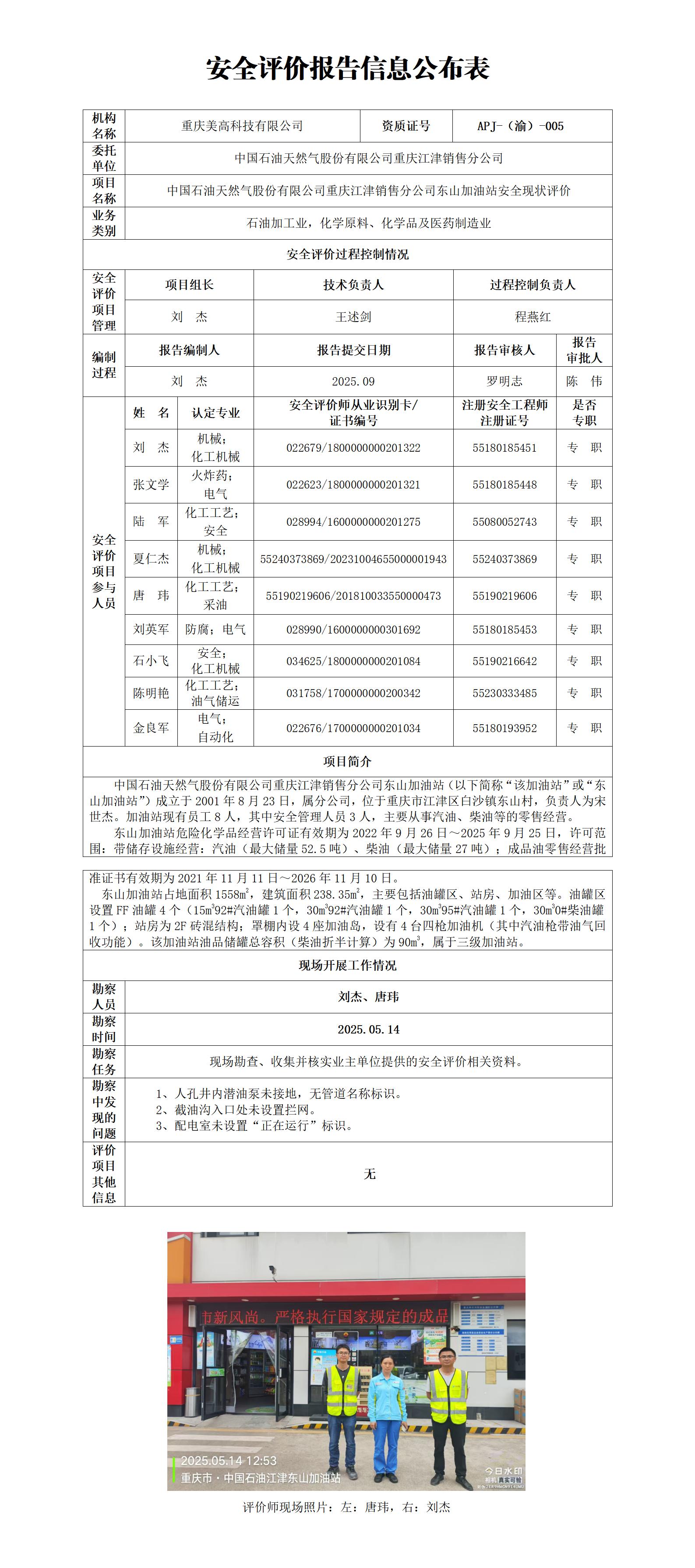 2025年3季度-中国石油天然气股份有限公司重庆江津销售分公司东山加油站安全现状评价