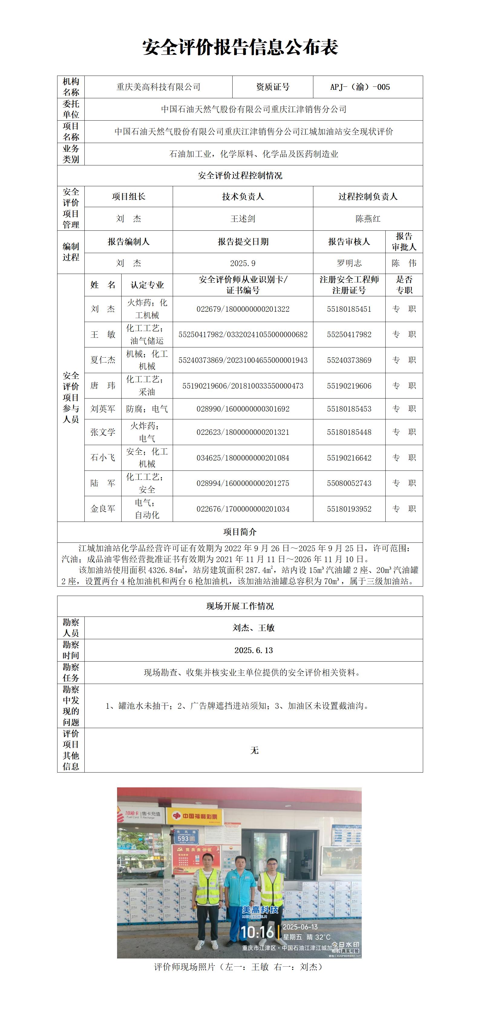 2025年3季度-中国石油天然气股份有限公司重庆江津销售分公司江城加油站安全现状评价