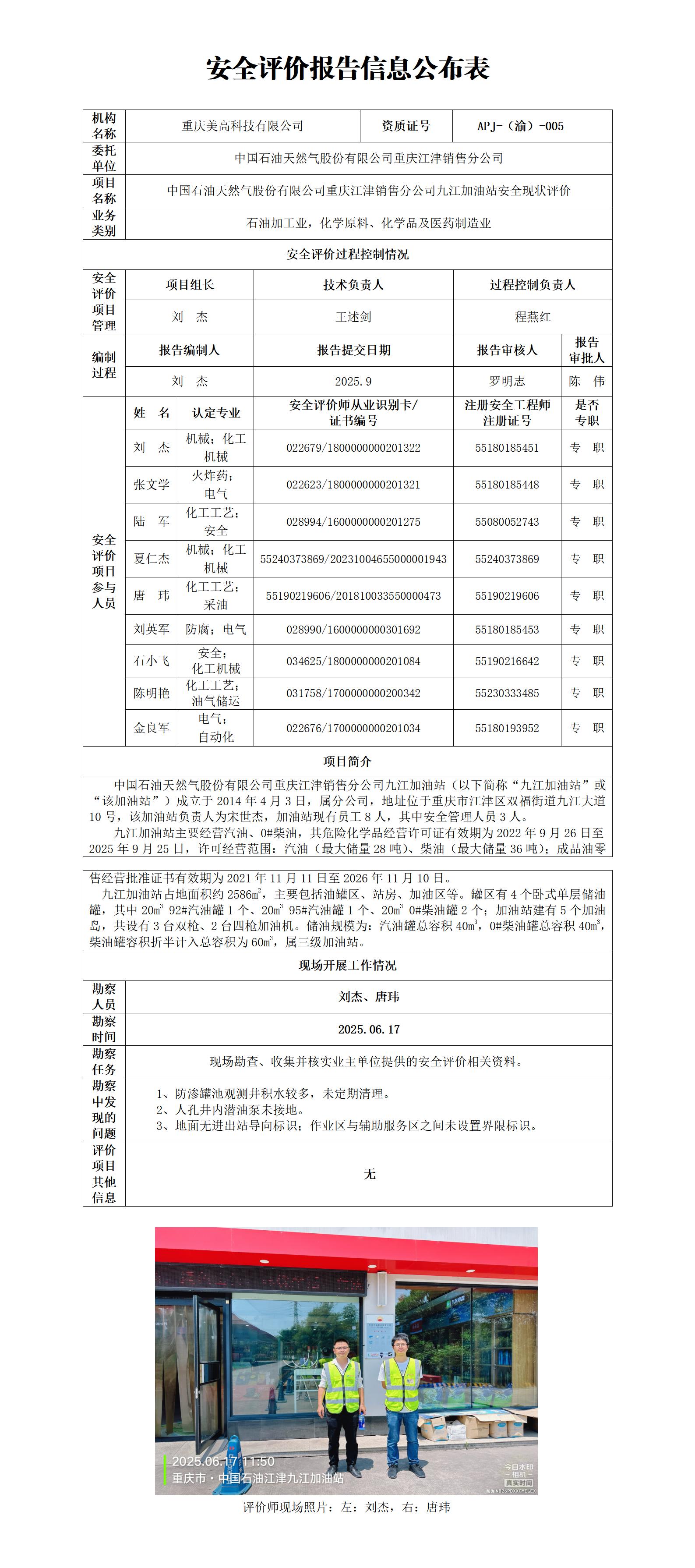 2025年3季度-中国石油天然气股份有限公司重庆江津销售分公司九江加油站安全现状评价