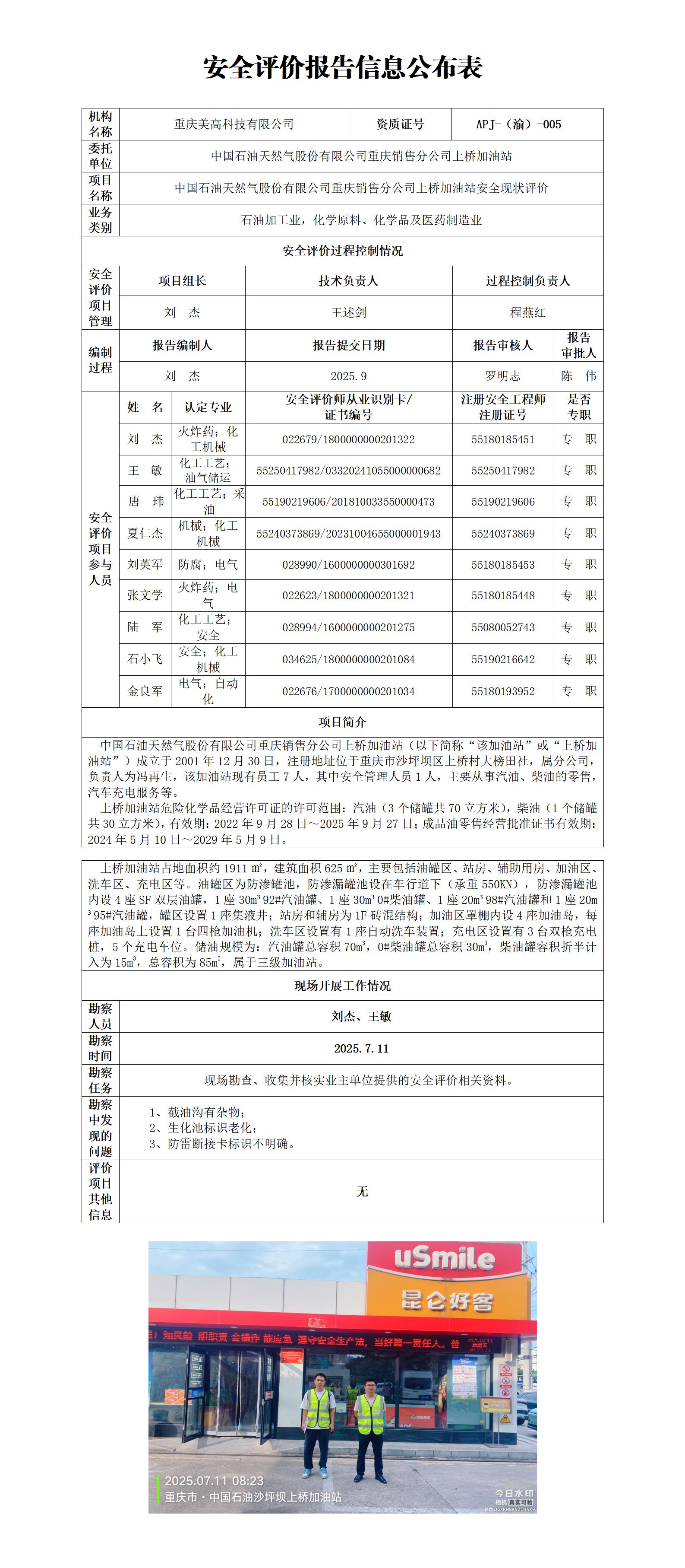 2025年3季度-中国石油天然气股份有限公司重庆销售分公司上桥加油站安全现状评价