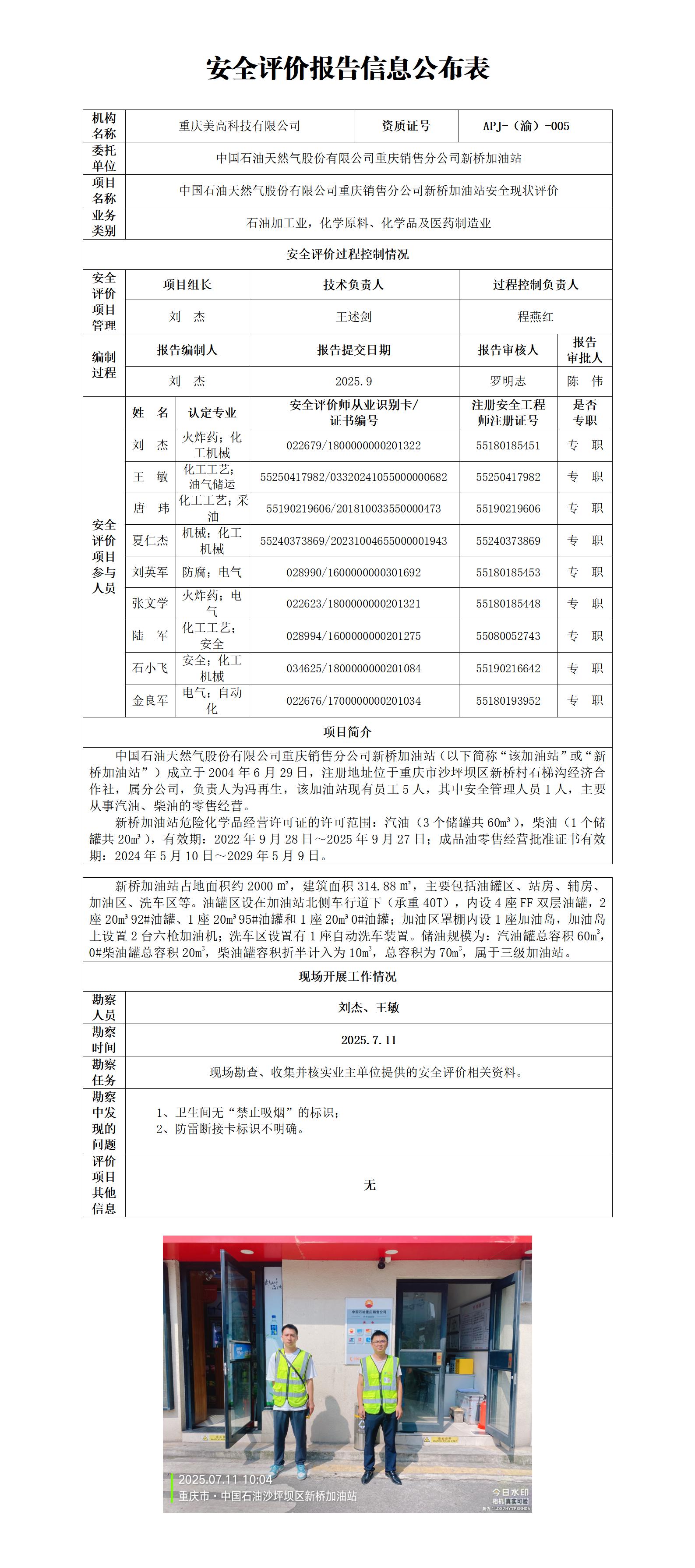 2025年3季度-中国石油天然气股份有限公司重庆销售分公司新桥加油站安全现状评价