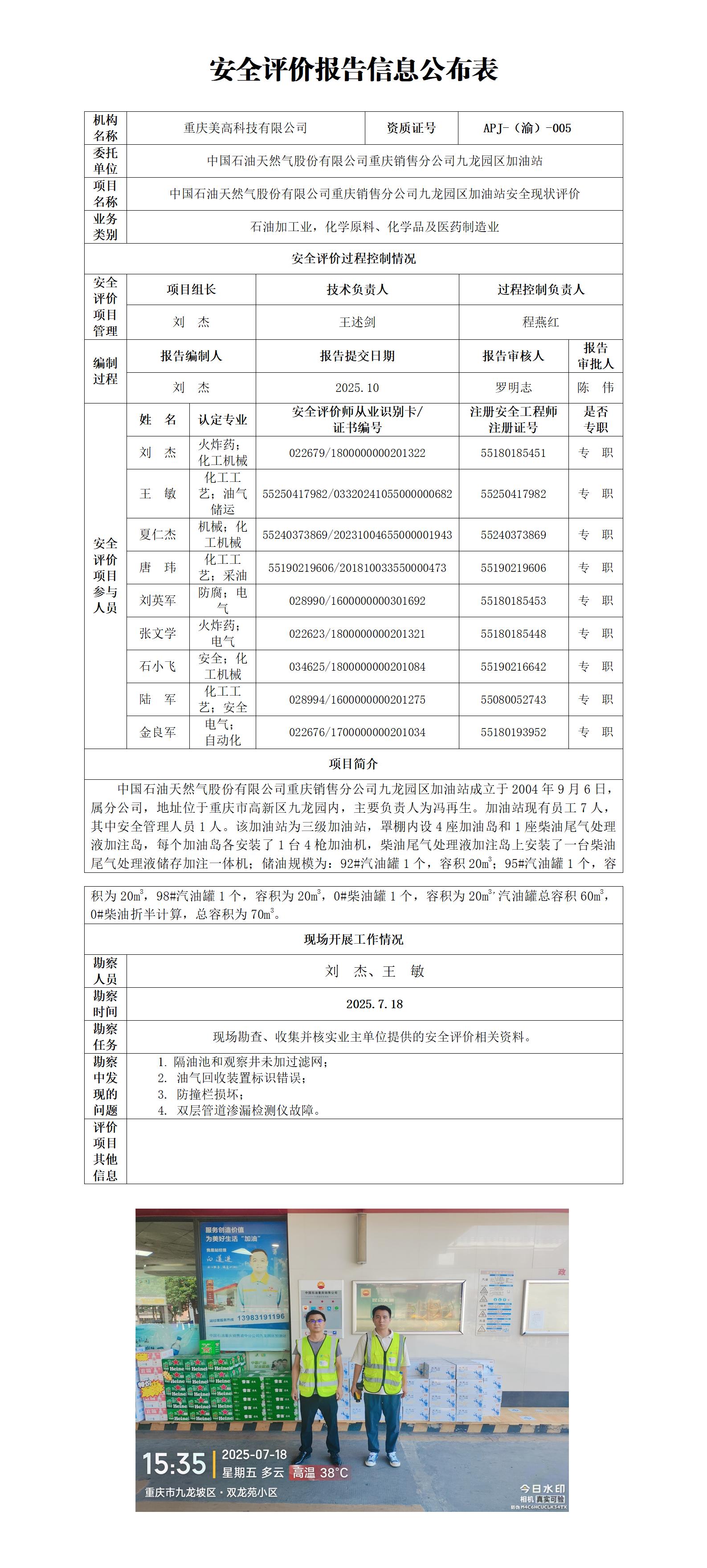 2025年4季度-中国石油天然气股份有限公司重庆销售分公司九龙园区加油站安全现状评价