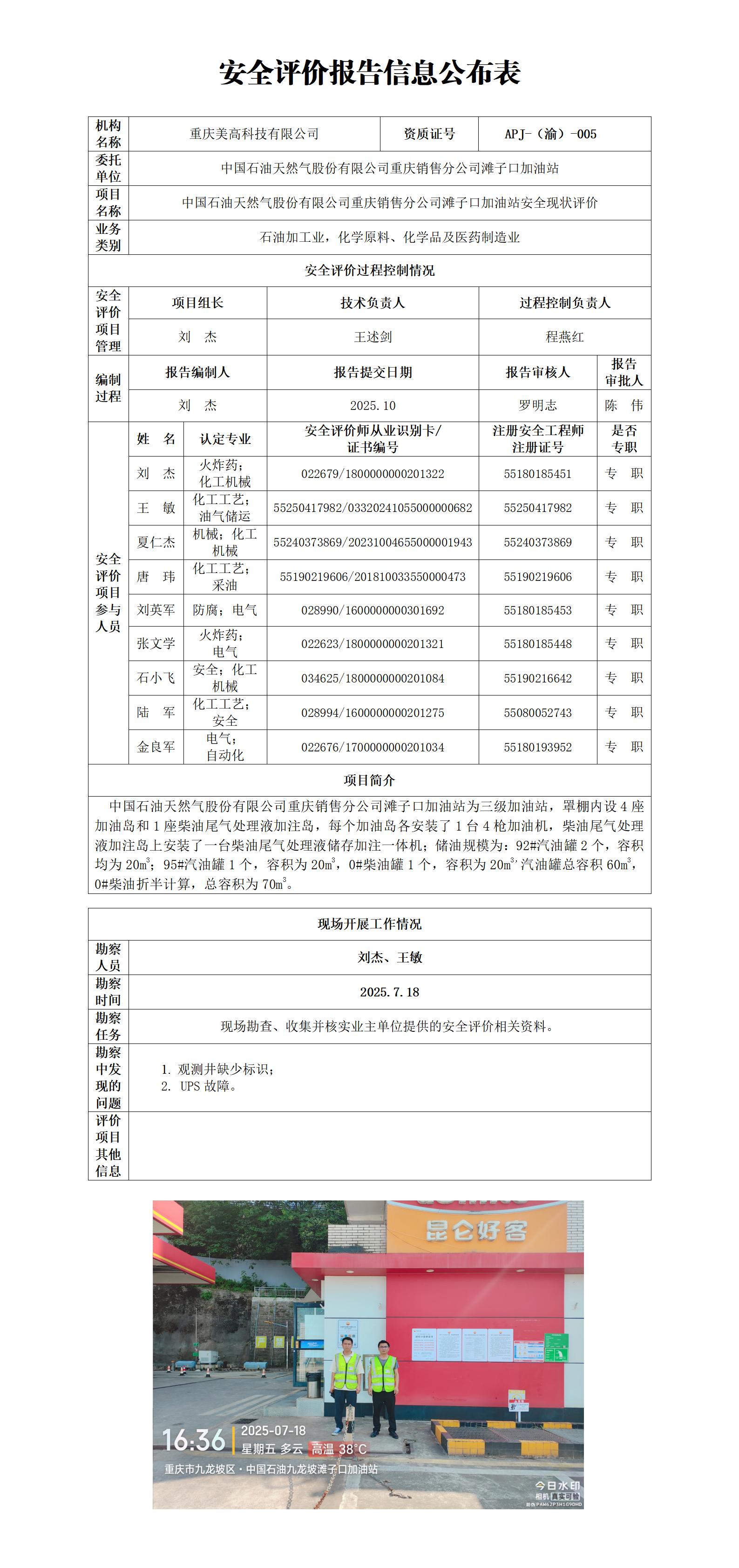 2025年4季度-中国石油天然气股份有限公司重庆销售分公司滩子口加油站安全现状评价