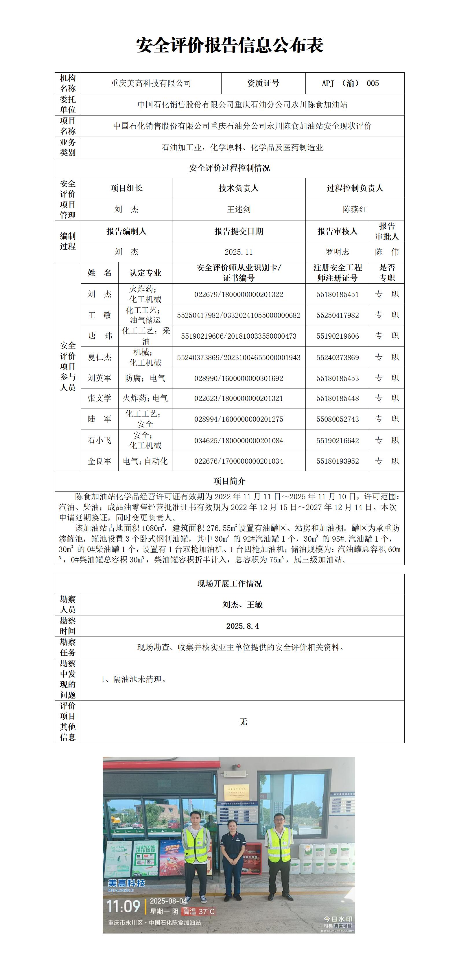 2025年4季度-中国石化销售股份有限公司重庆石油分公司永川陈食加油站安全现状评价