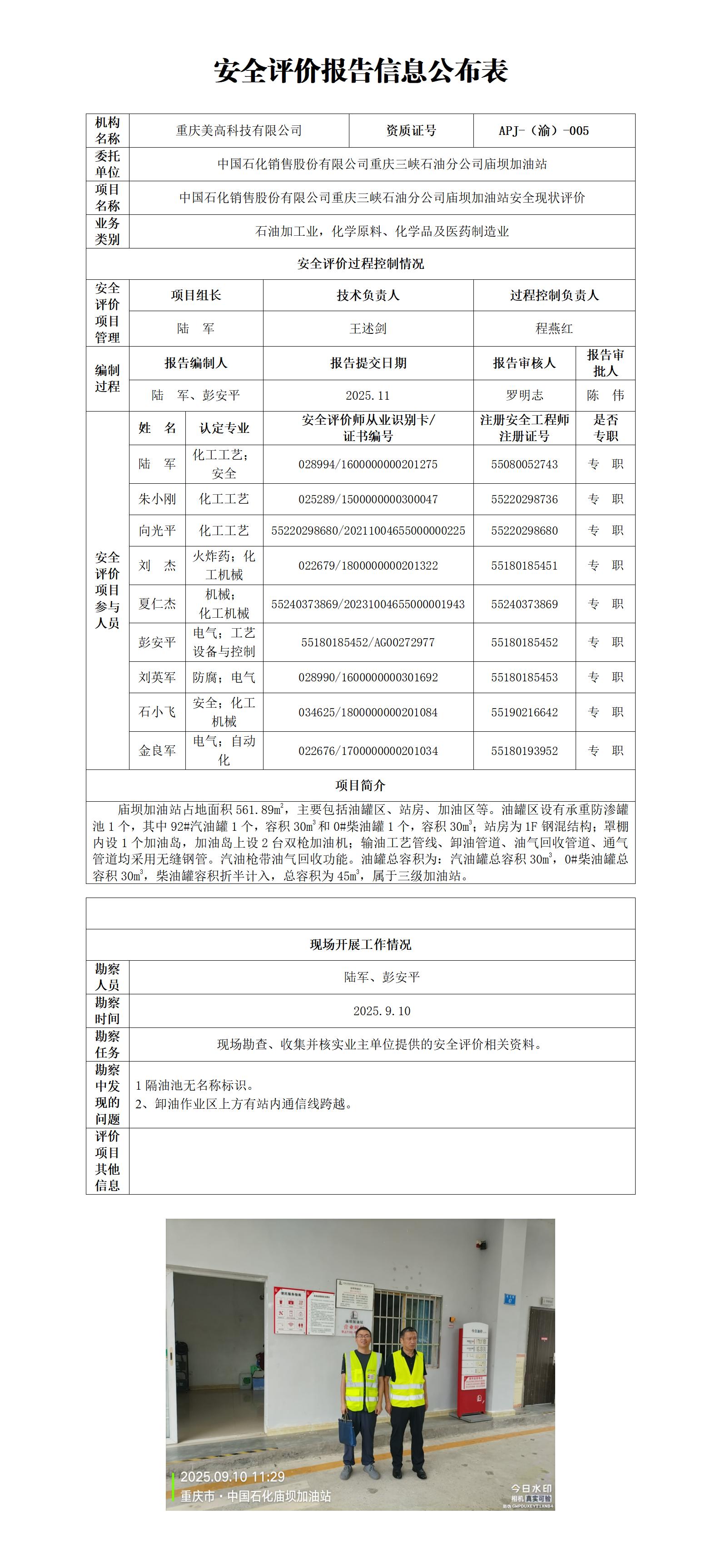 2025年4季度-中国石化销售股份有限公司重庆三峡石油分公司庙坝加油站安全现状评价