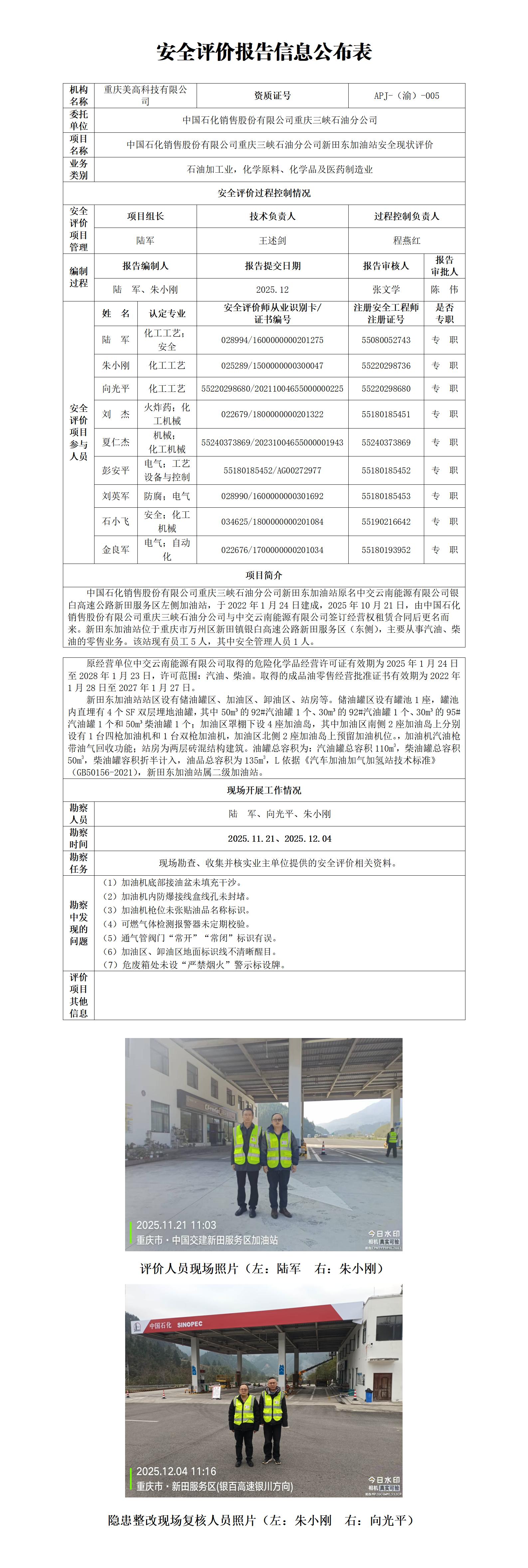 2025年4季度-中国石化销售股份有限公司重庆三峡石油分公司新田东加油站安全现状评价