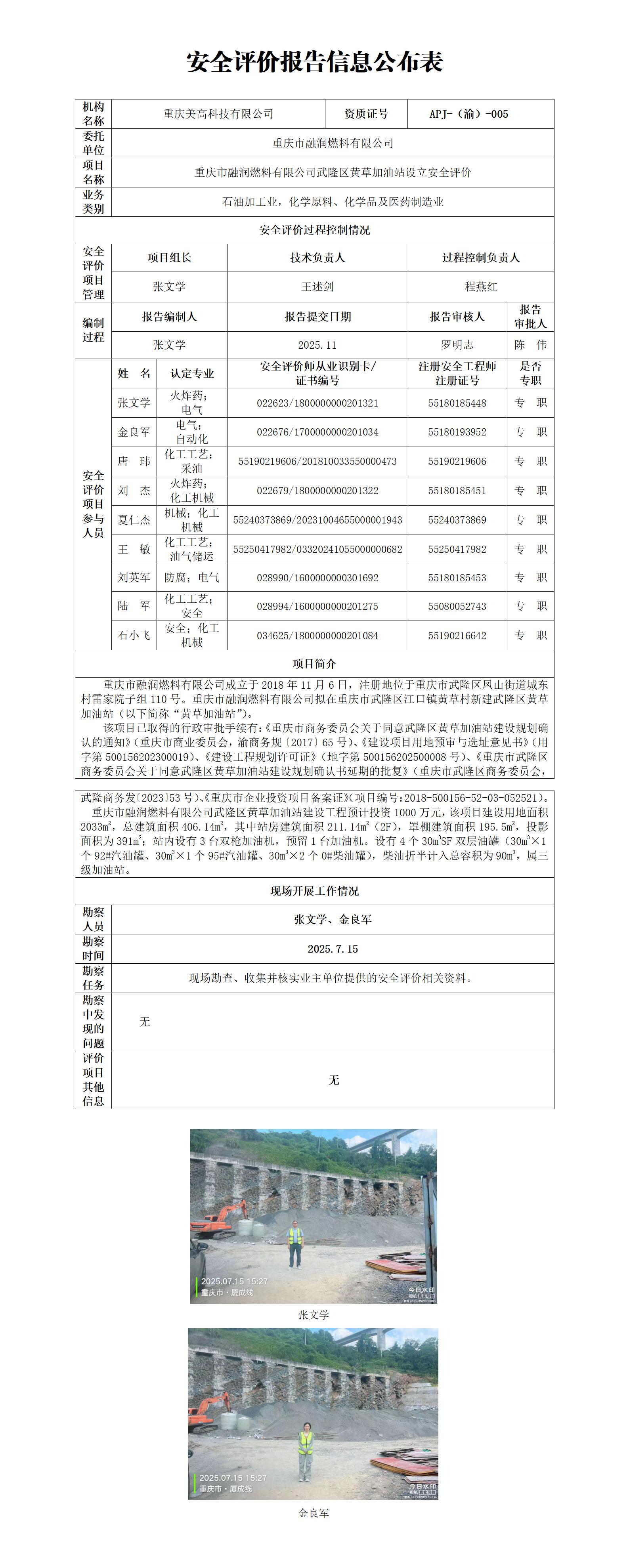 2025年4季度-重庆市融润燃料有限公司武隆区黄草加油站设立安全评价