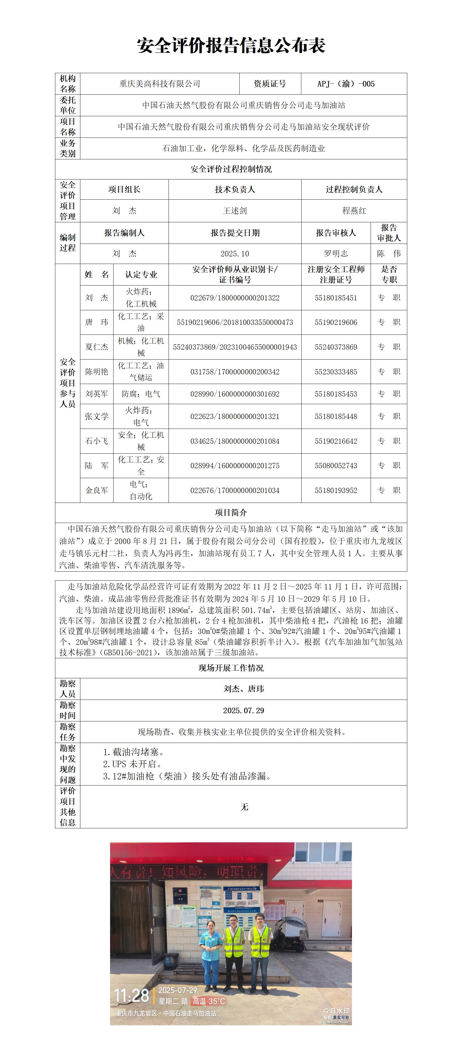 2025年4季度-中国石油天然气股份有限公司重庆销售分公司走马加油站安全现状评价