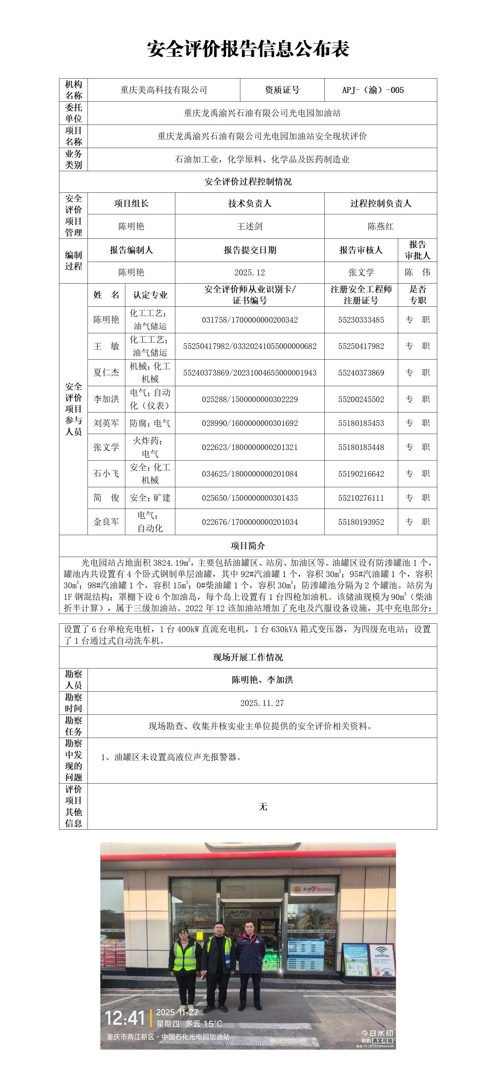 2025年4季度-重庆龙禹渝兴石油有限公司光电园加油站安全现状评价