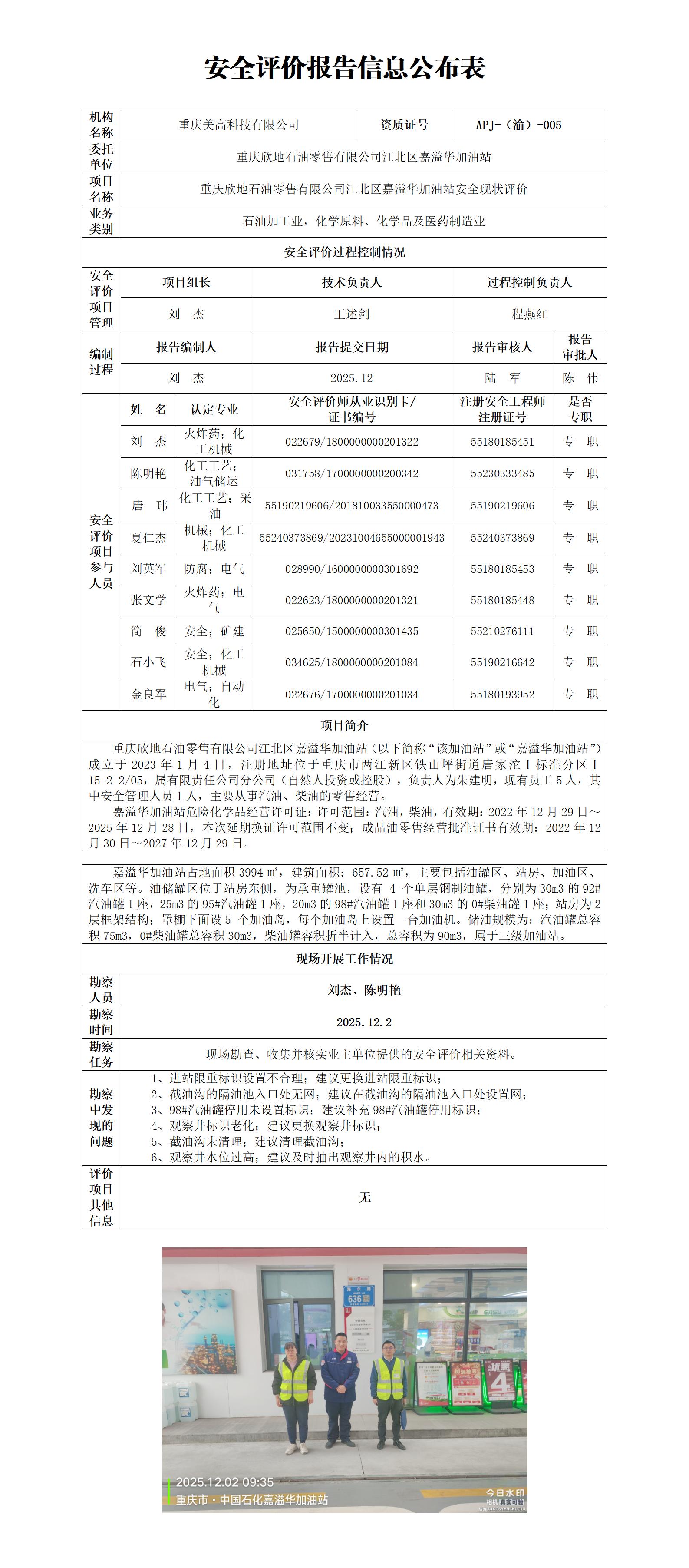 2025年4季度-重庆欣地石油零售有限公司江北区嘉溢华加油站安全现状评价