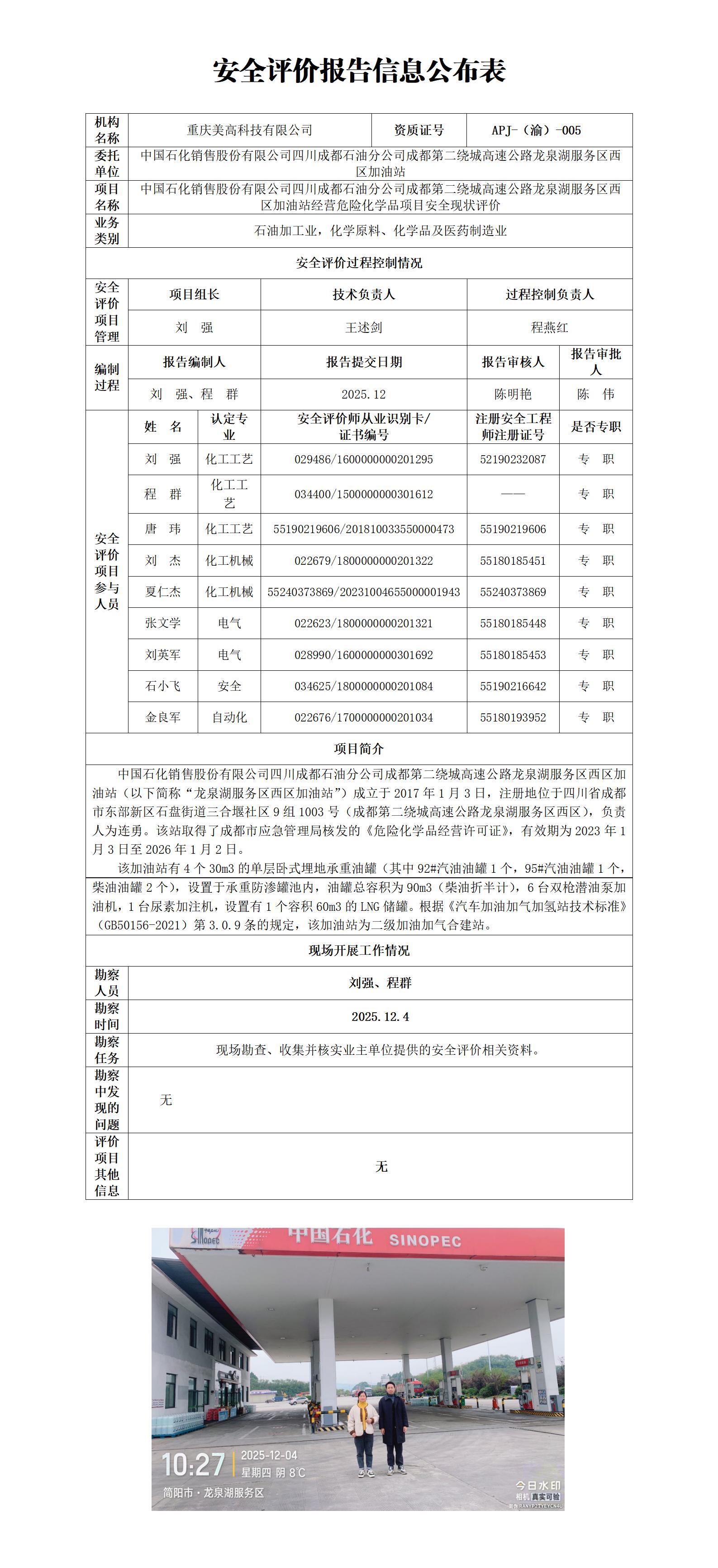 2025年4季度-中国石化销售股份有限公司四川成都石油分公司成都第二绕城高速公路龙泉湖服务区西区加油站经营危险化学品项目安全现状评价