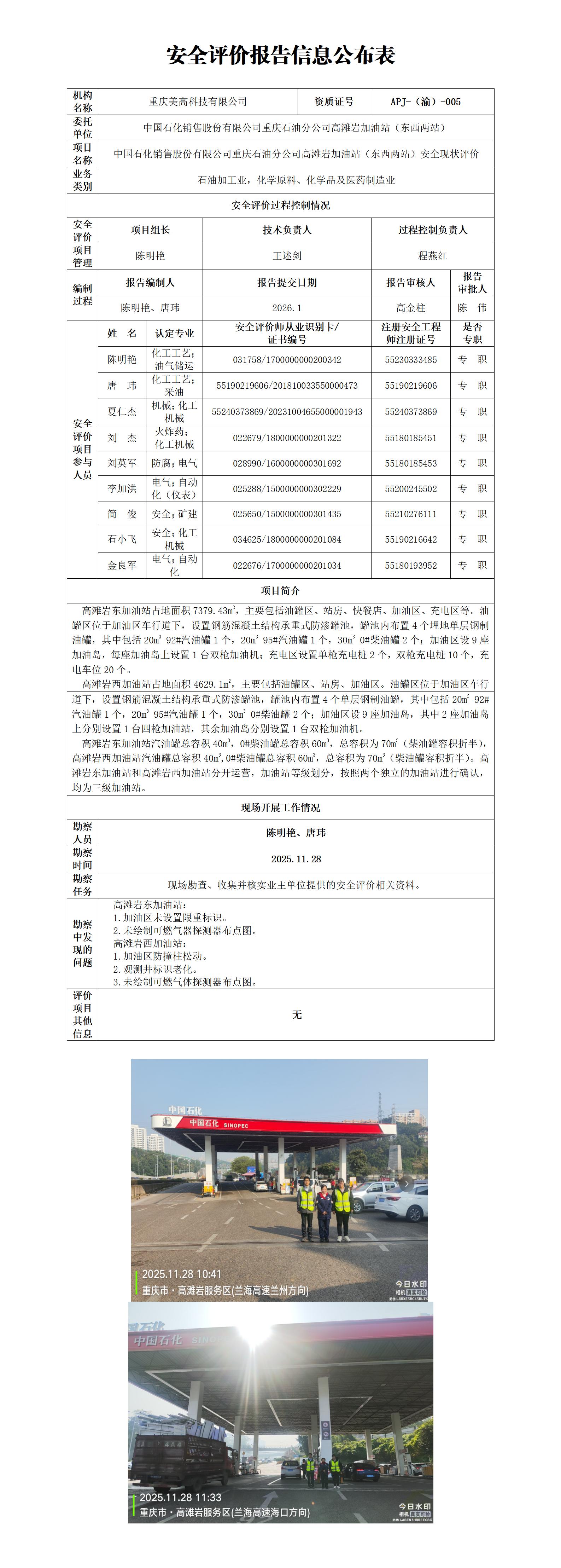 2026年1季度-中国石化销售股份有限公司重庆石油分公司高滩岩加油站(东西两站)安全现状评价