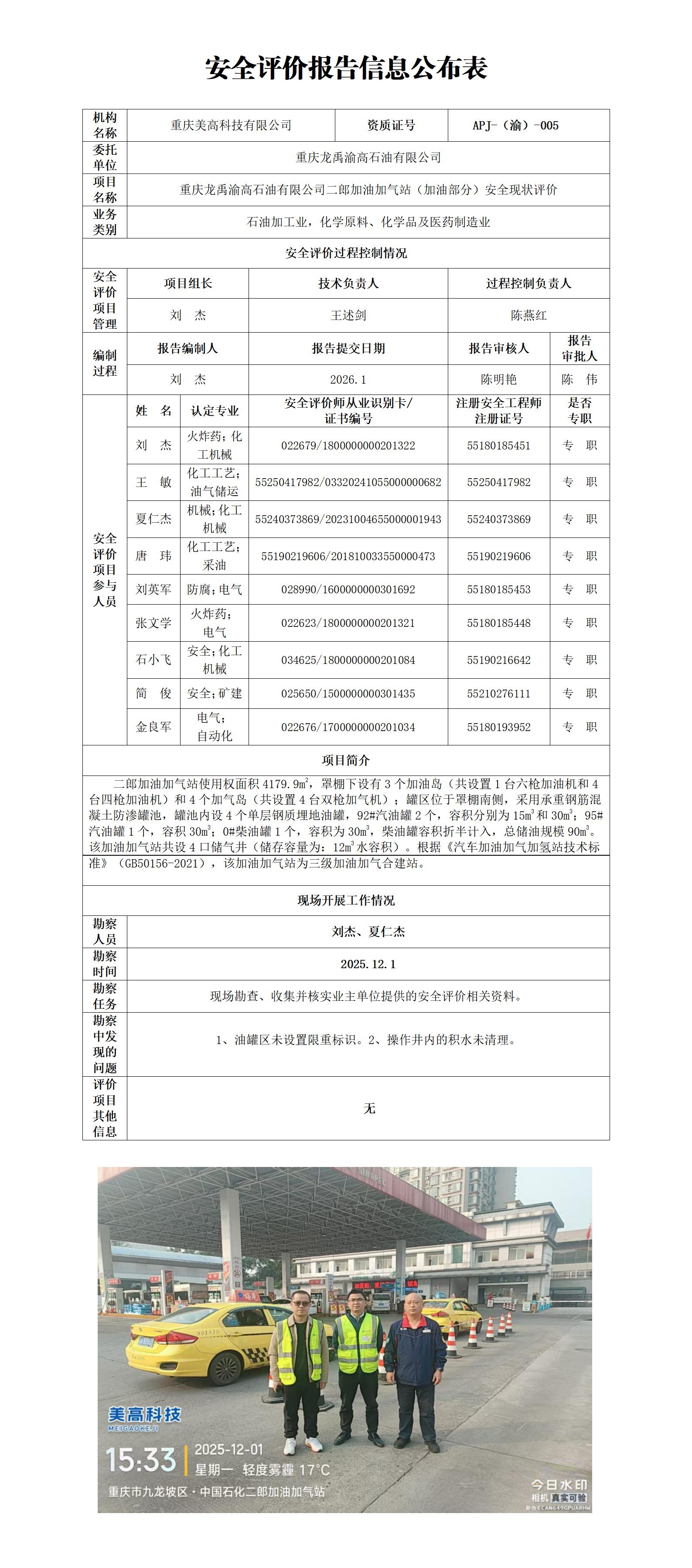 2026年1季度-重庆龙禹渝高石油有限公司二郎加油加气站(加油部分)安全现状评价