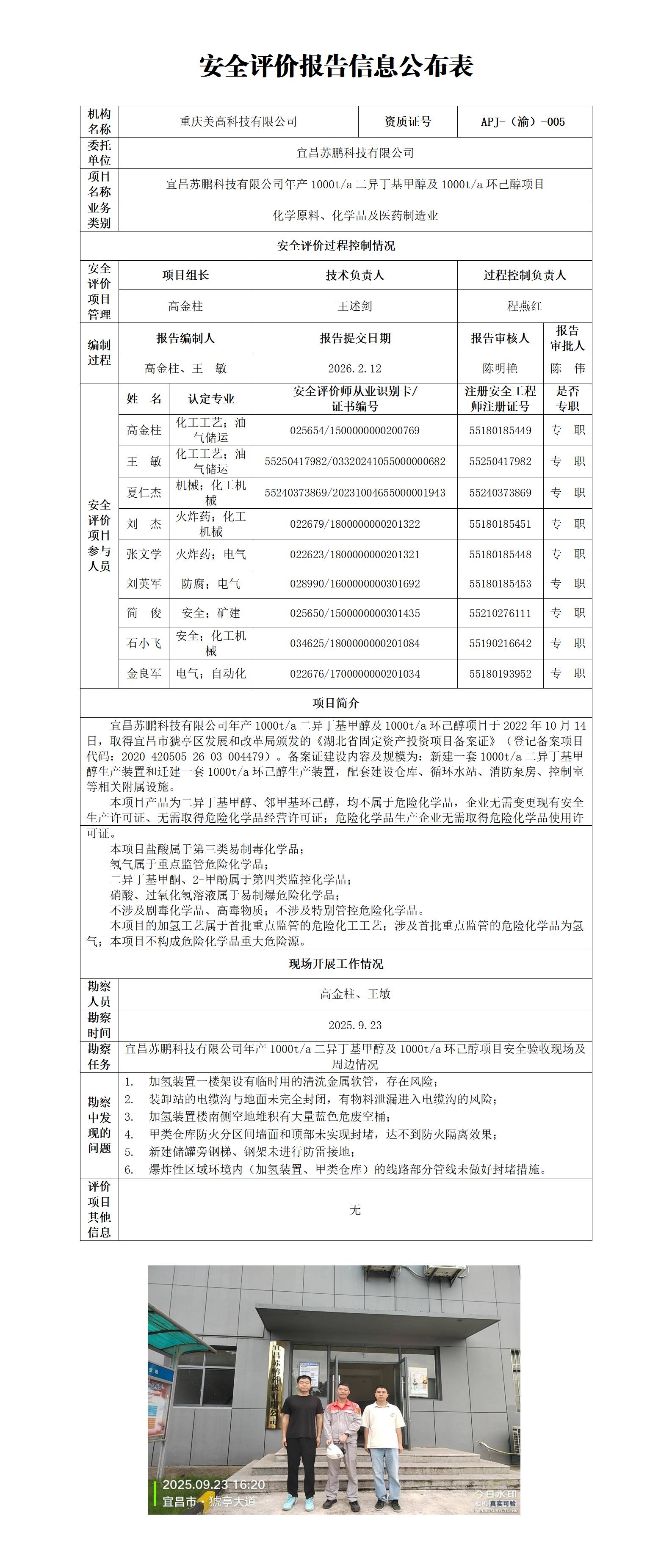 2026年1季度-宜昌苏鹏科技有限公司年产1000ta二异丁基甲醇及1000ta环己醇项目安全验收评价