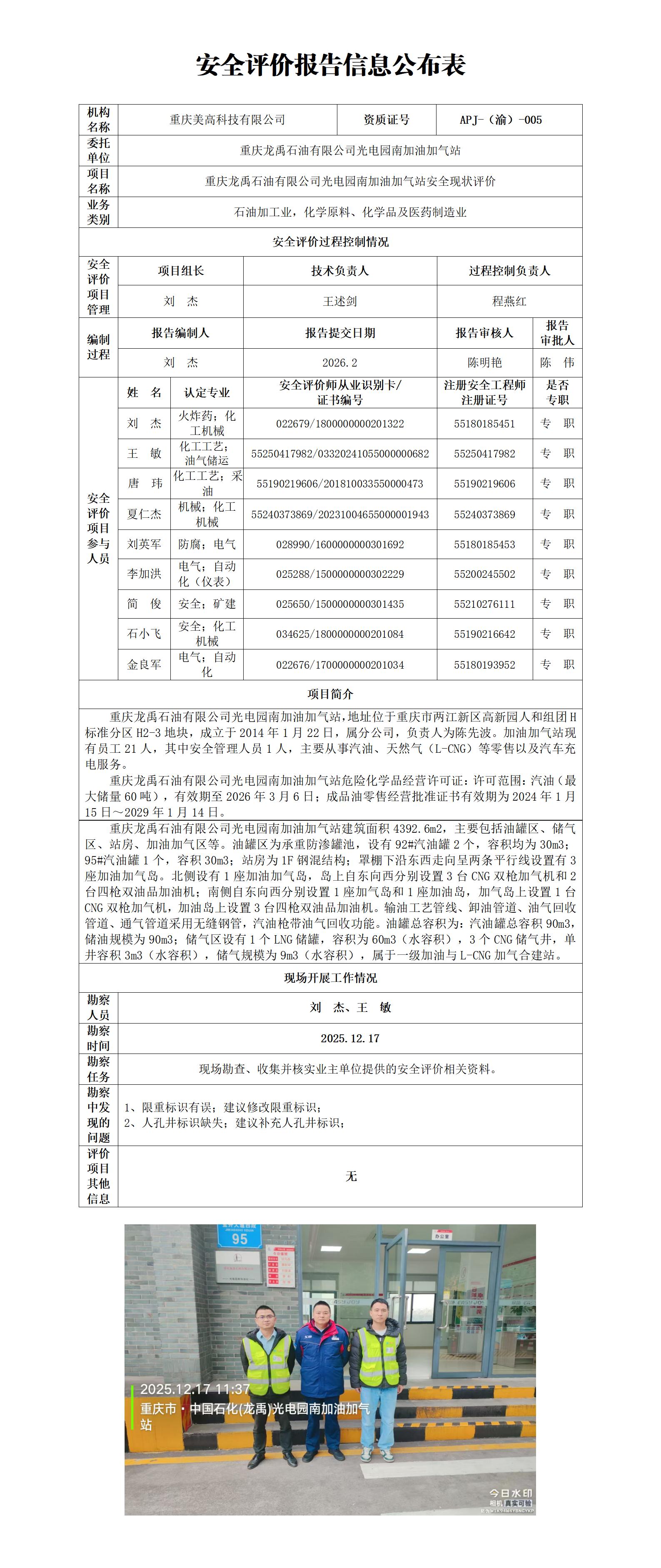 2026年1季度-重庆龙禹石油有限公司光电园南加油加气站安全现状评价