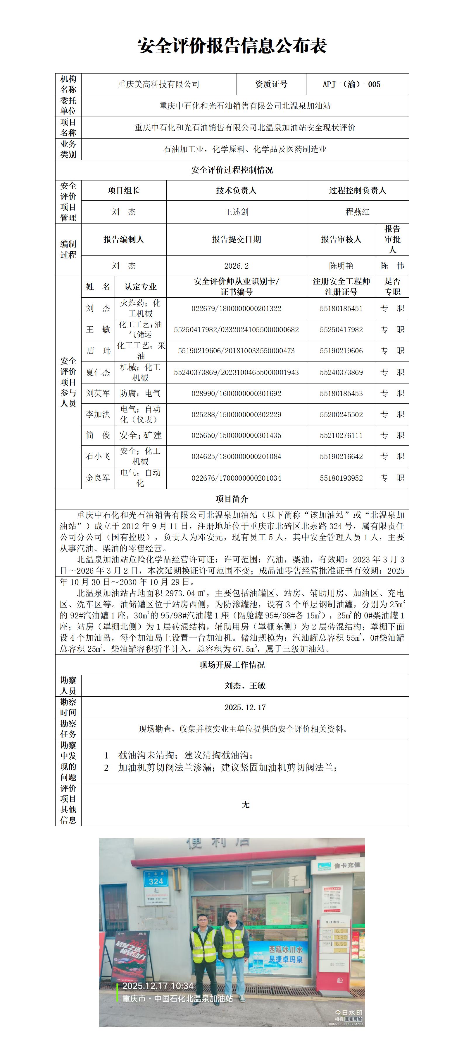 2026年1季度-重庆中石化和光石油销售有限公司北温泉加油站安全现状评价