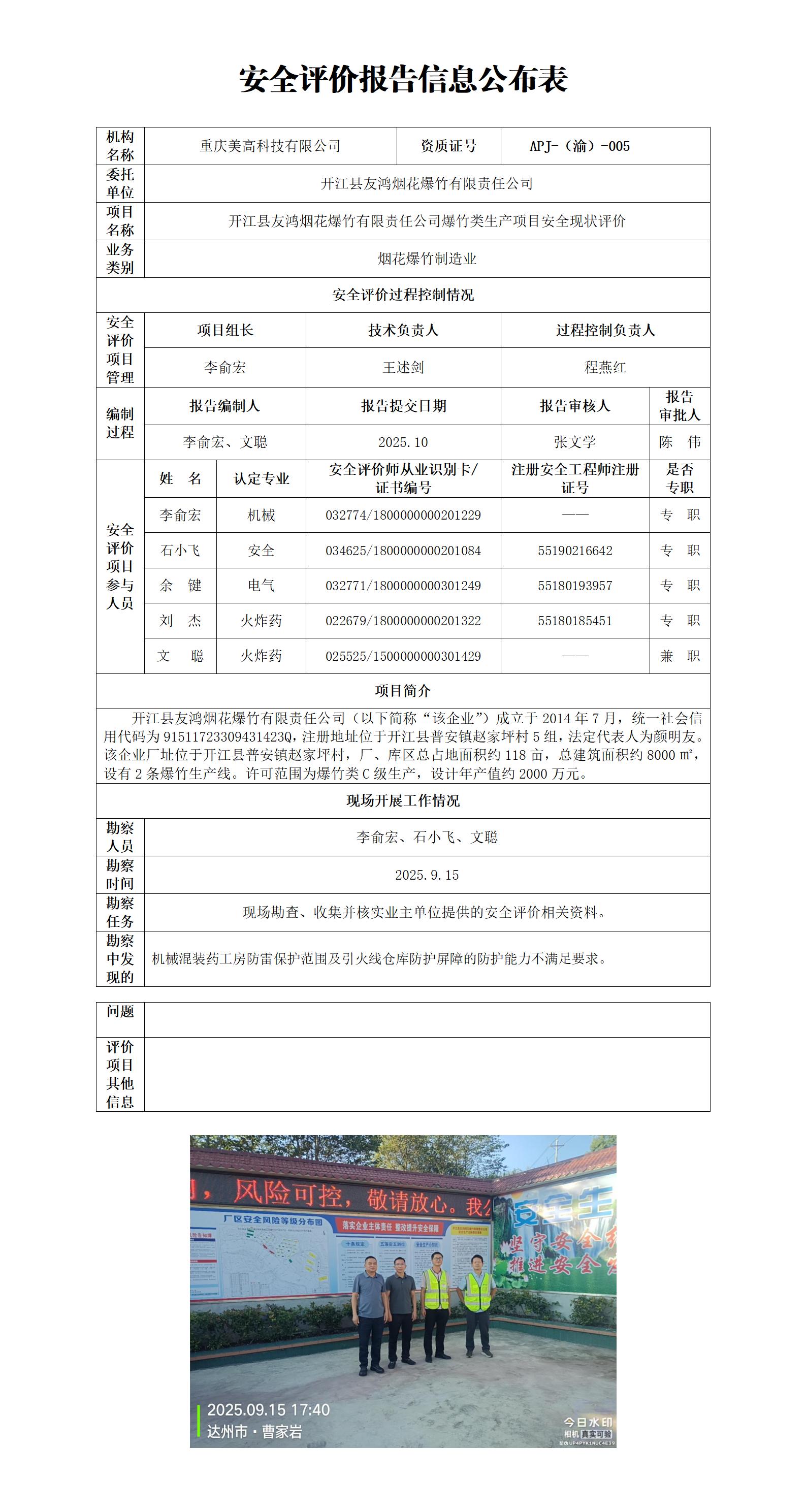 2025年4季度-开江县友鸿烟花爆竹有限责任公司爆竹类生产项目安全现状评价