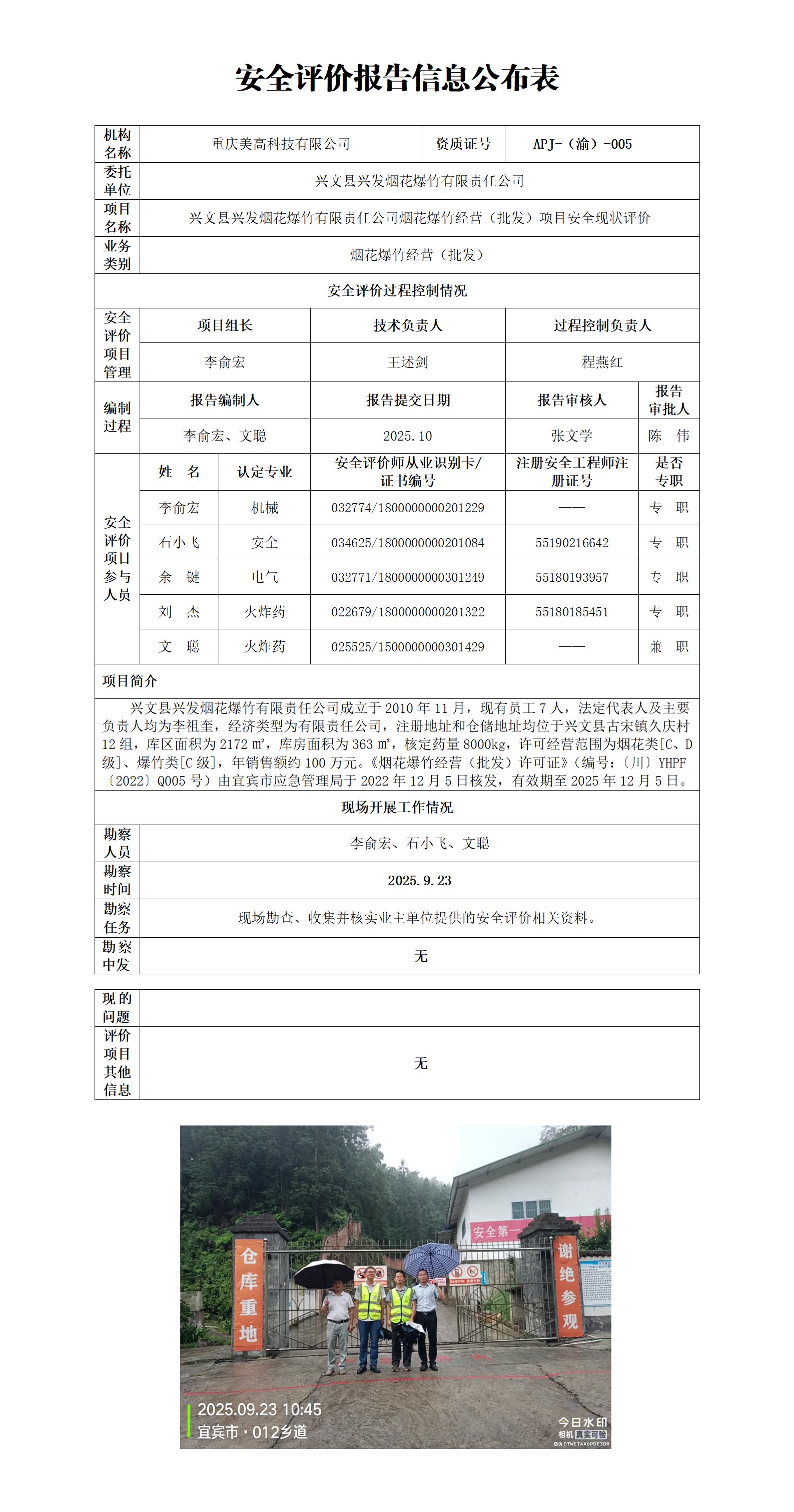 2025年4季度-兴文县兴发烟花爆竹有限责任公司烟花爆竹经营(批发)项目安全现状评价