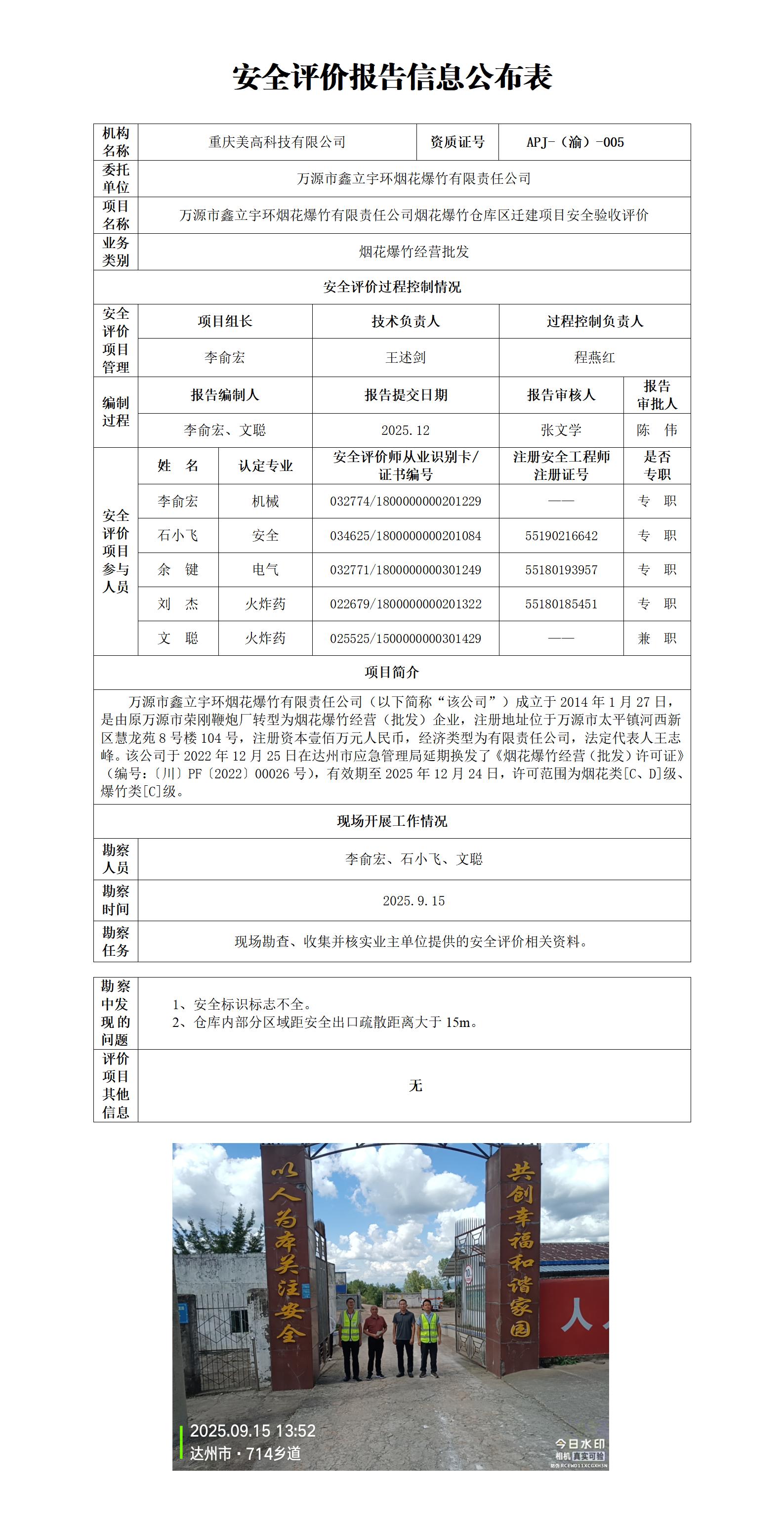 2025年4季度-万源市鑫立宇环烟花爆竹有限责任公司烟花爆竹仓库区迁建项目安全验收评价