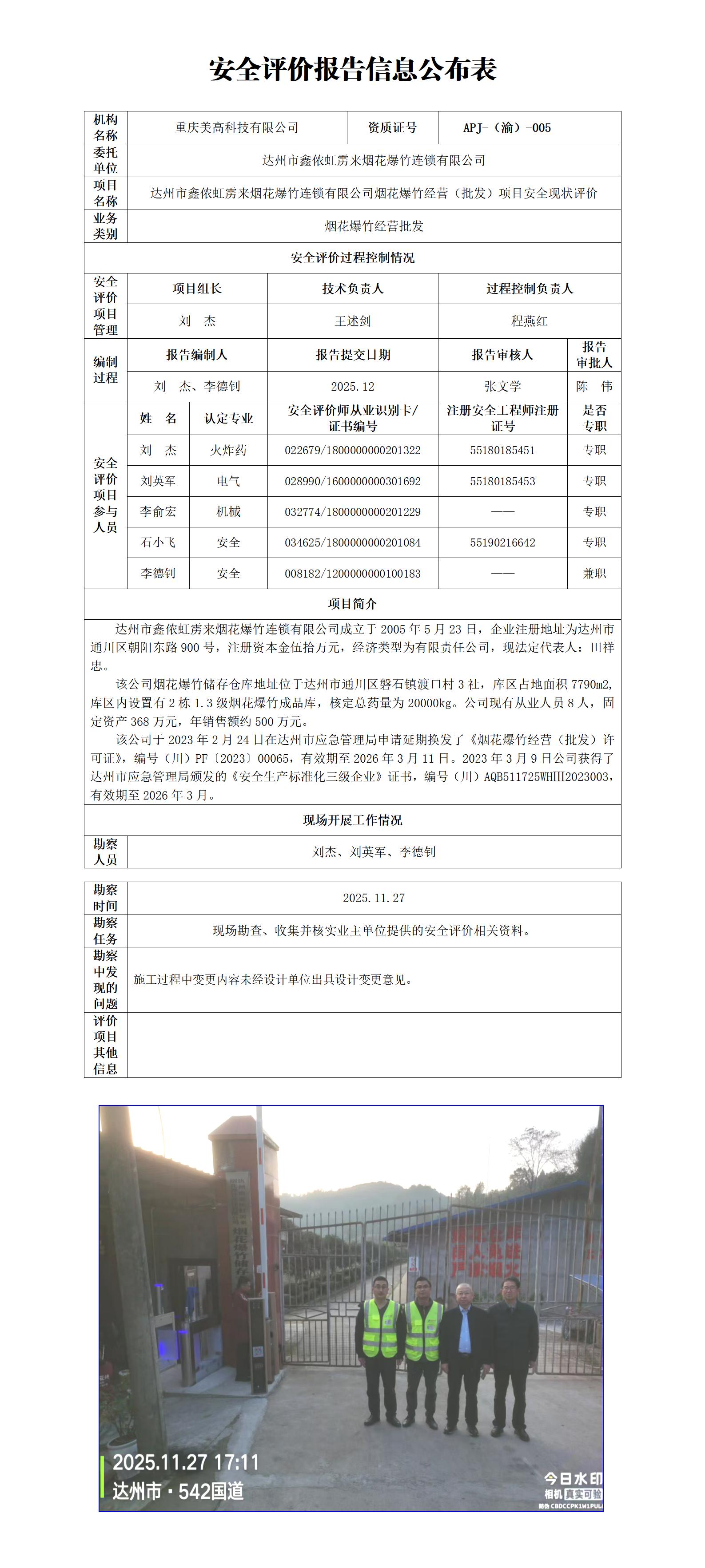 2025年4季度-达州市鑫侬虹雳来烟花爆竹连锁有限公司烟花爆竹经营(批发)项目安全现状评价