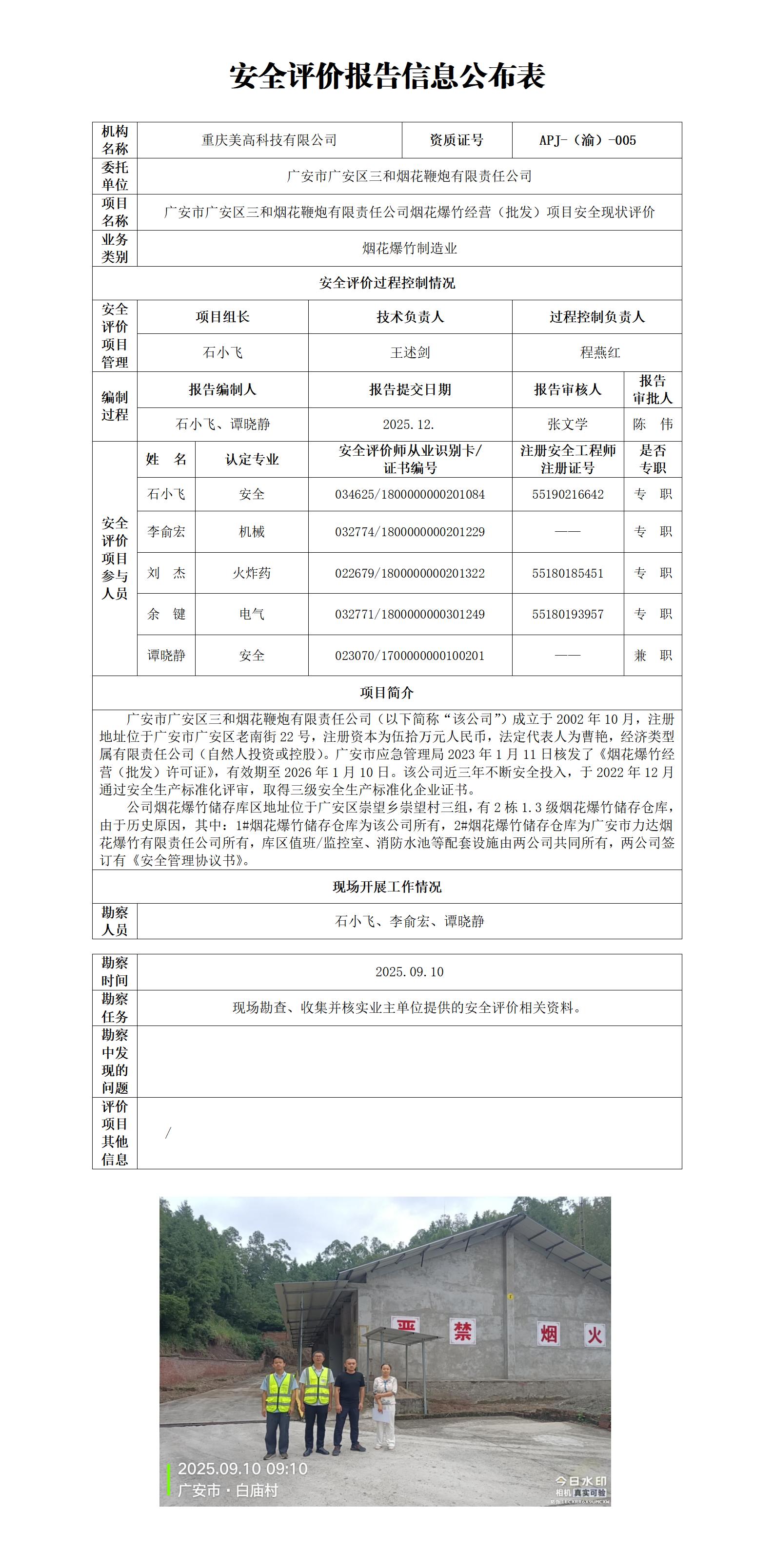 2025年4季度-广安市广安区三和烟花鞭炮有限责任公司烟花爆竹经营(批发)项目安全现状评价