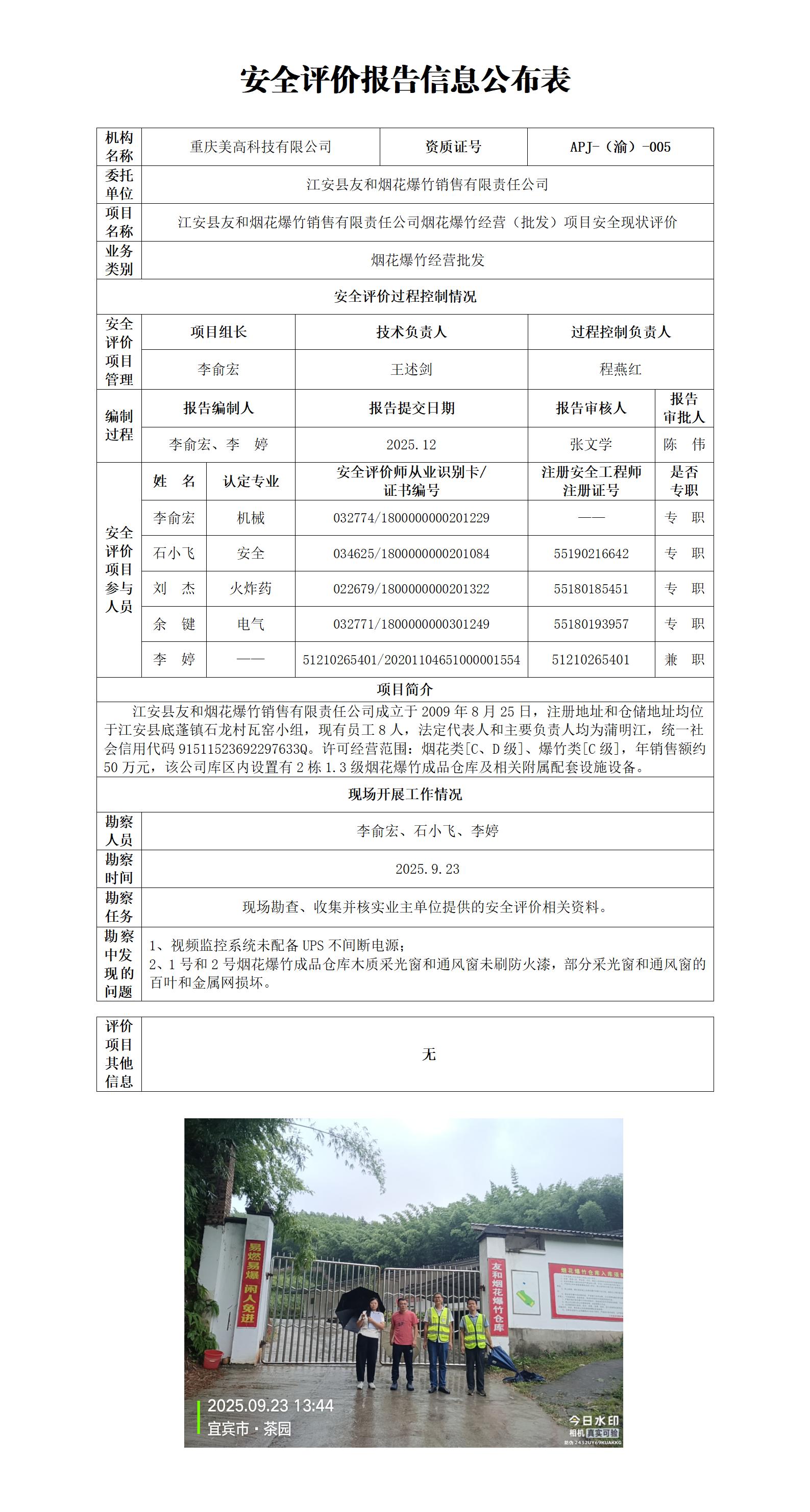 2025年4季度-江安县友和烟花爆竹销售有限责任公司烟花爆竹经营(批发)项目安全现状评价