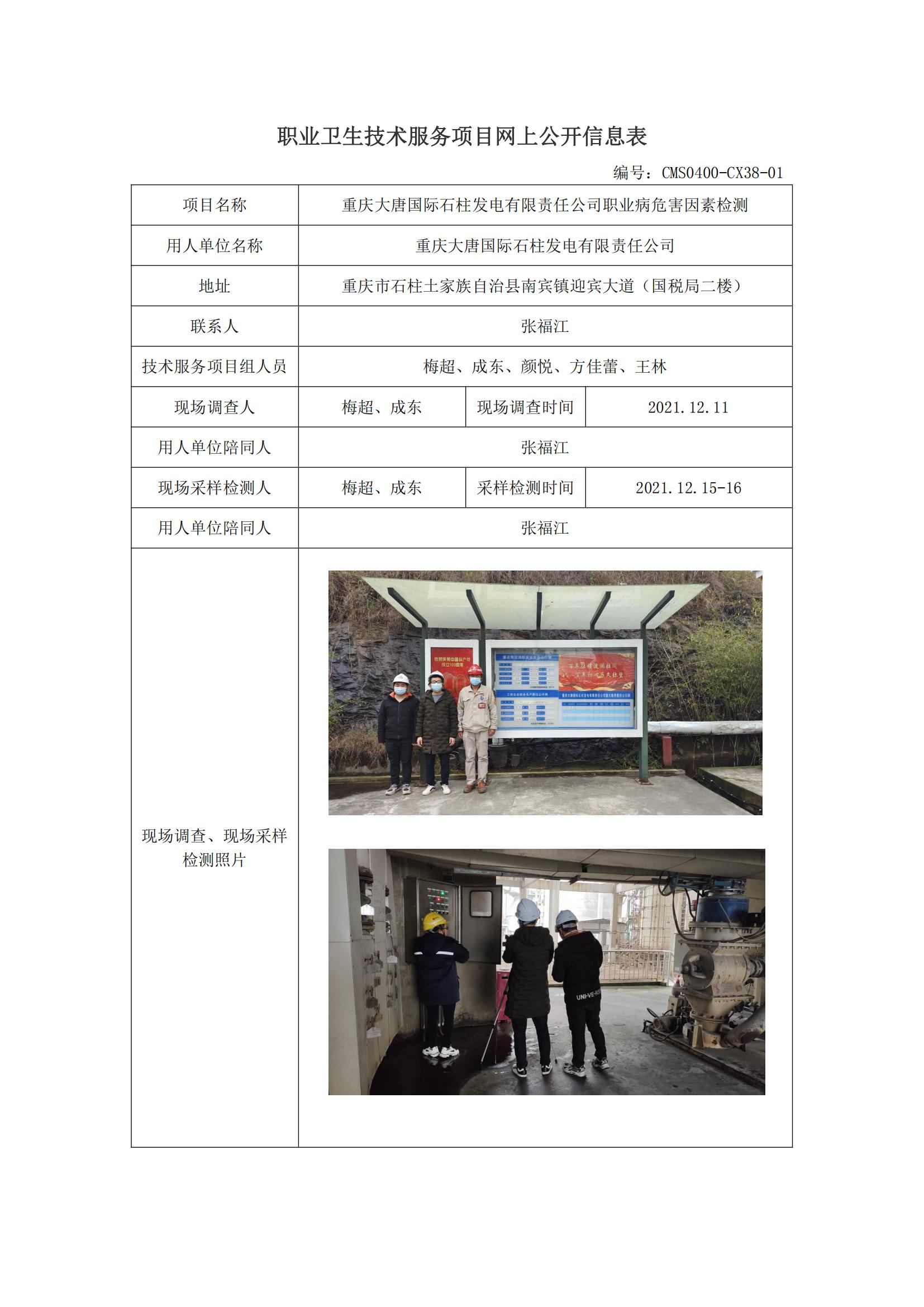 2021年-重庆大唐国际石柱发电有限责任公司职业病危害因素检测