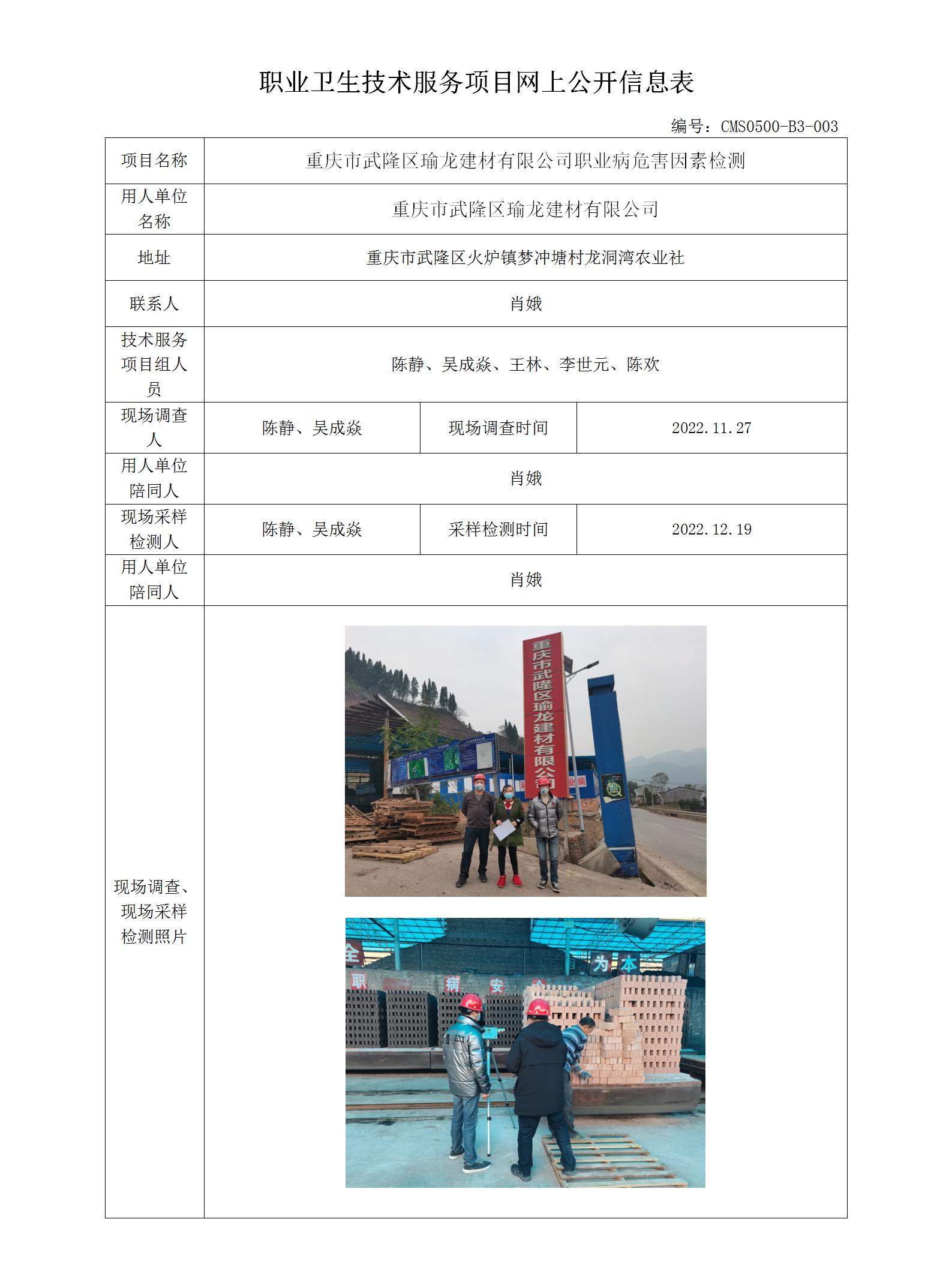 2023年-重庆市武隆区瑜龙建材有限公司职业病危害因素检测