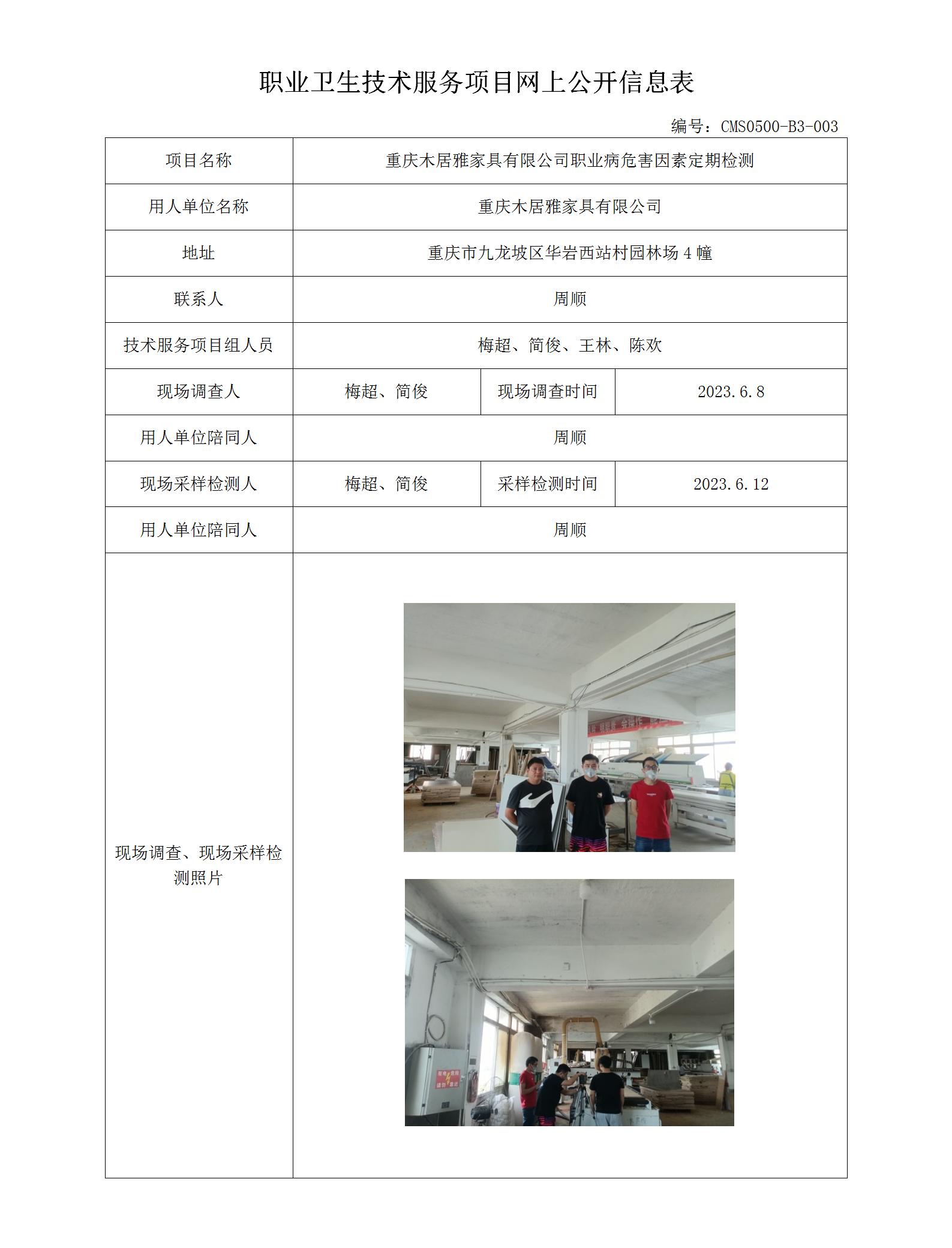 2023年-重庆木居雅家具有限公司职业病危害因素定期检测