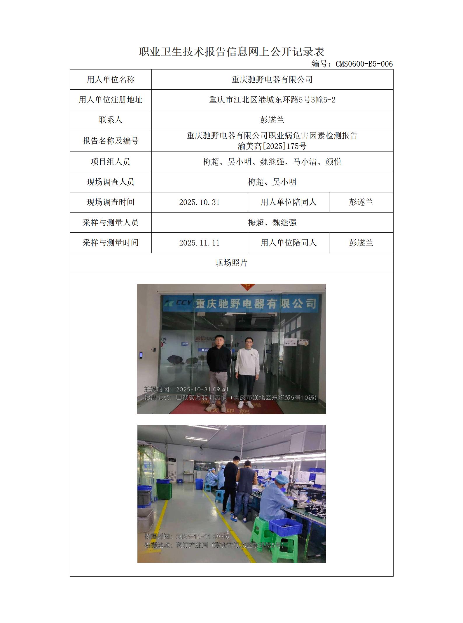 2025年-重庆驰野电器有限公司职业病危害因素检测