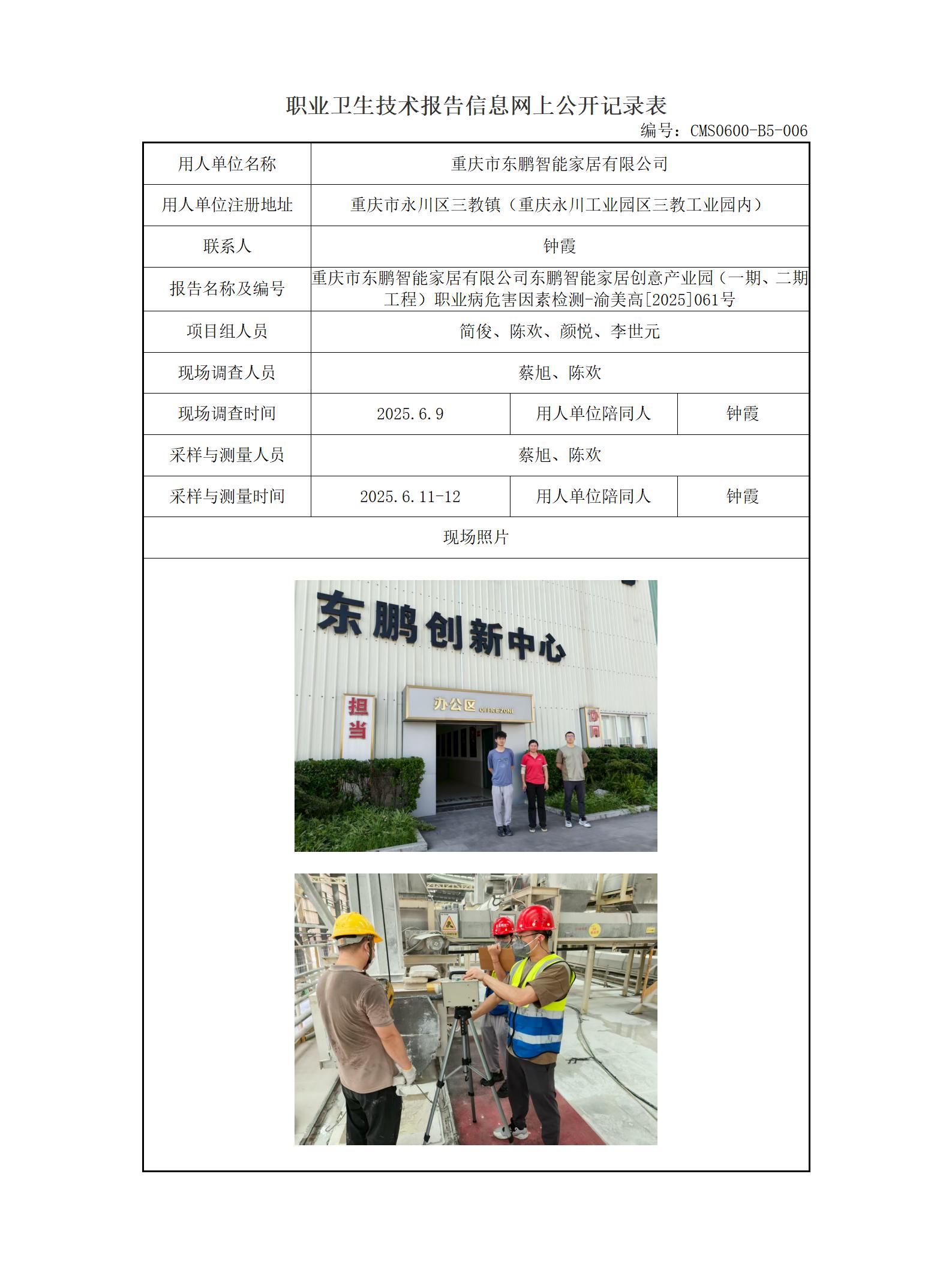 2025年-重庆市东鹏智能家居有限公司东鹏智能家居创意产业园(一期、二期工程)职业病危害因素检测