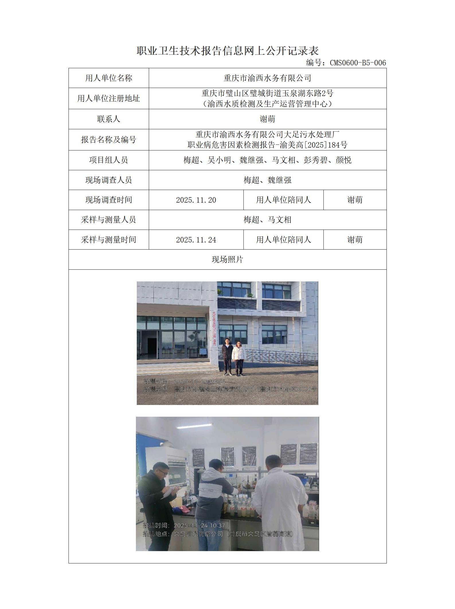 2025年-重庆市渝西水务有限公司大足污水处理厂职业病危害因素检测