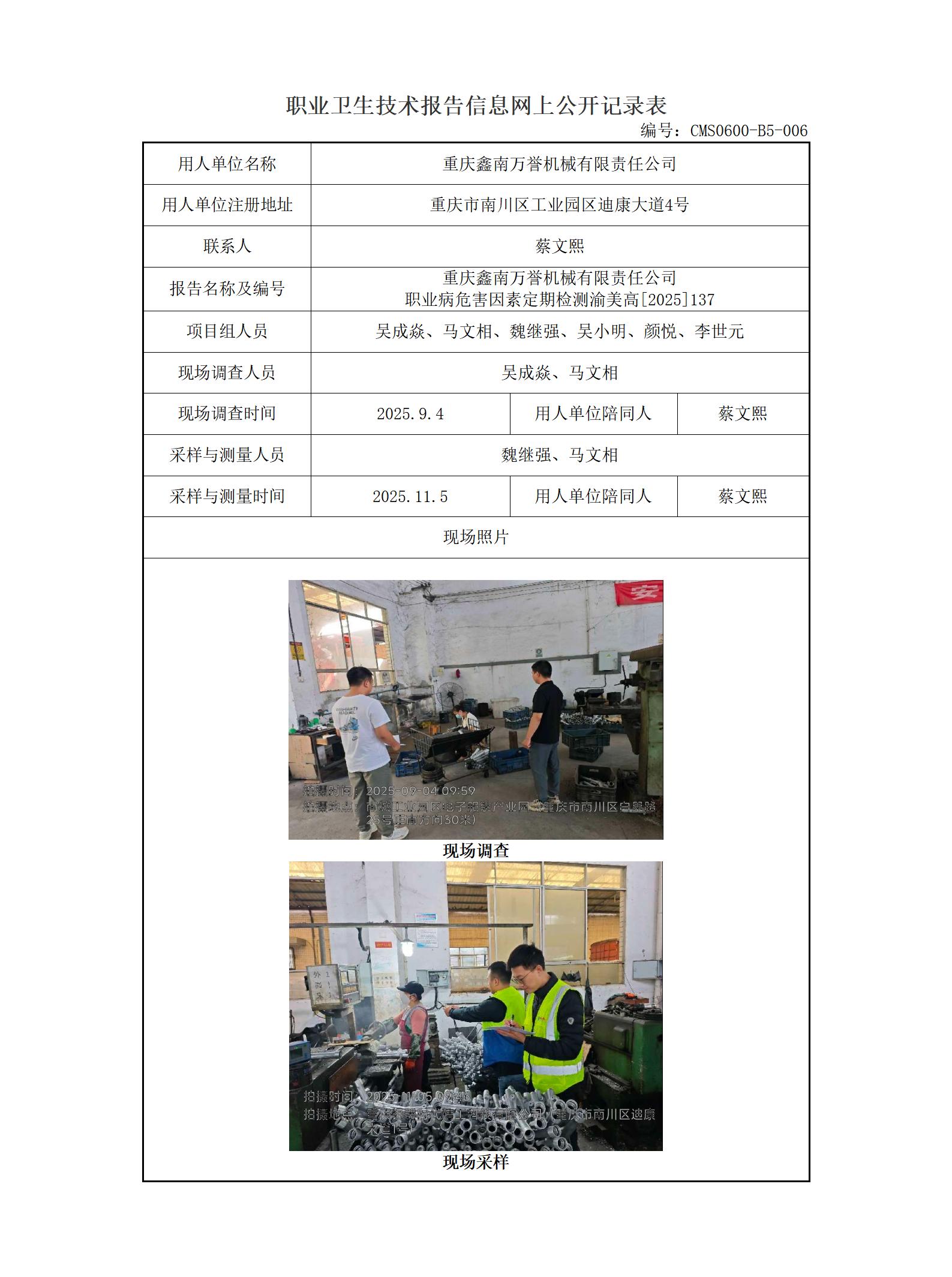 2025年-重庆鑫南万誉机械有限责任公司职业病危害因素检测