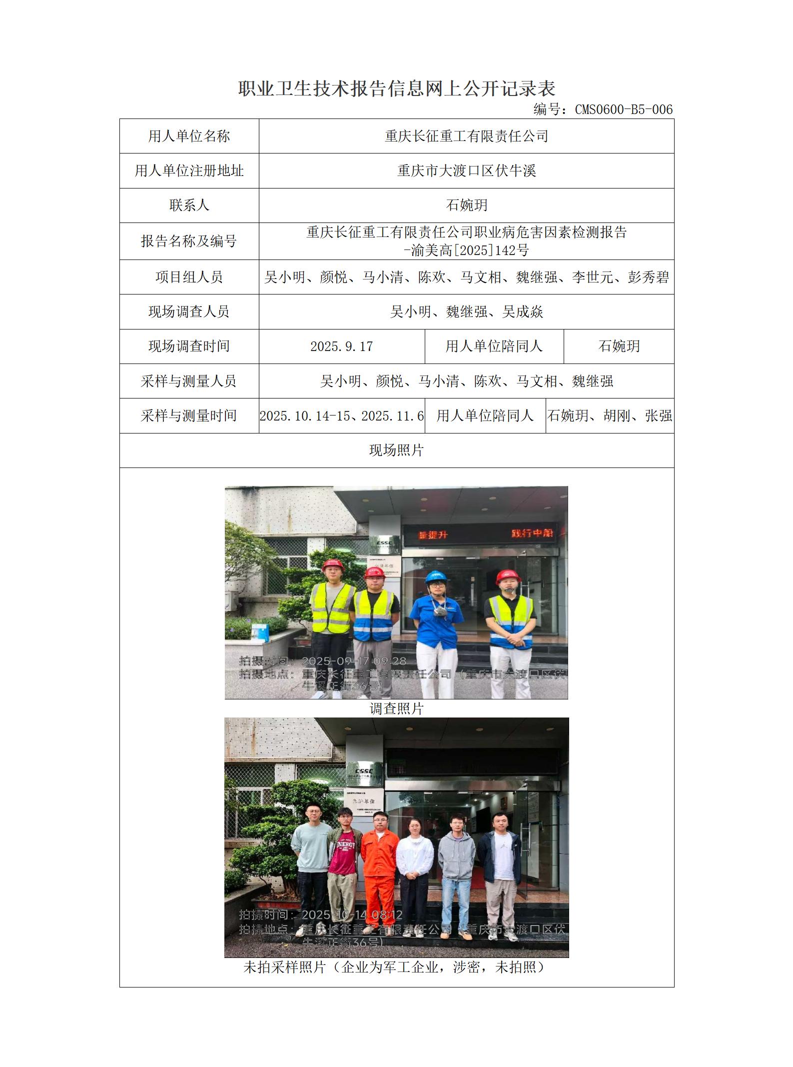 2025年-重庆长征重工有限责任公司职业病危害因素检测