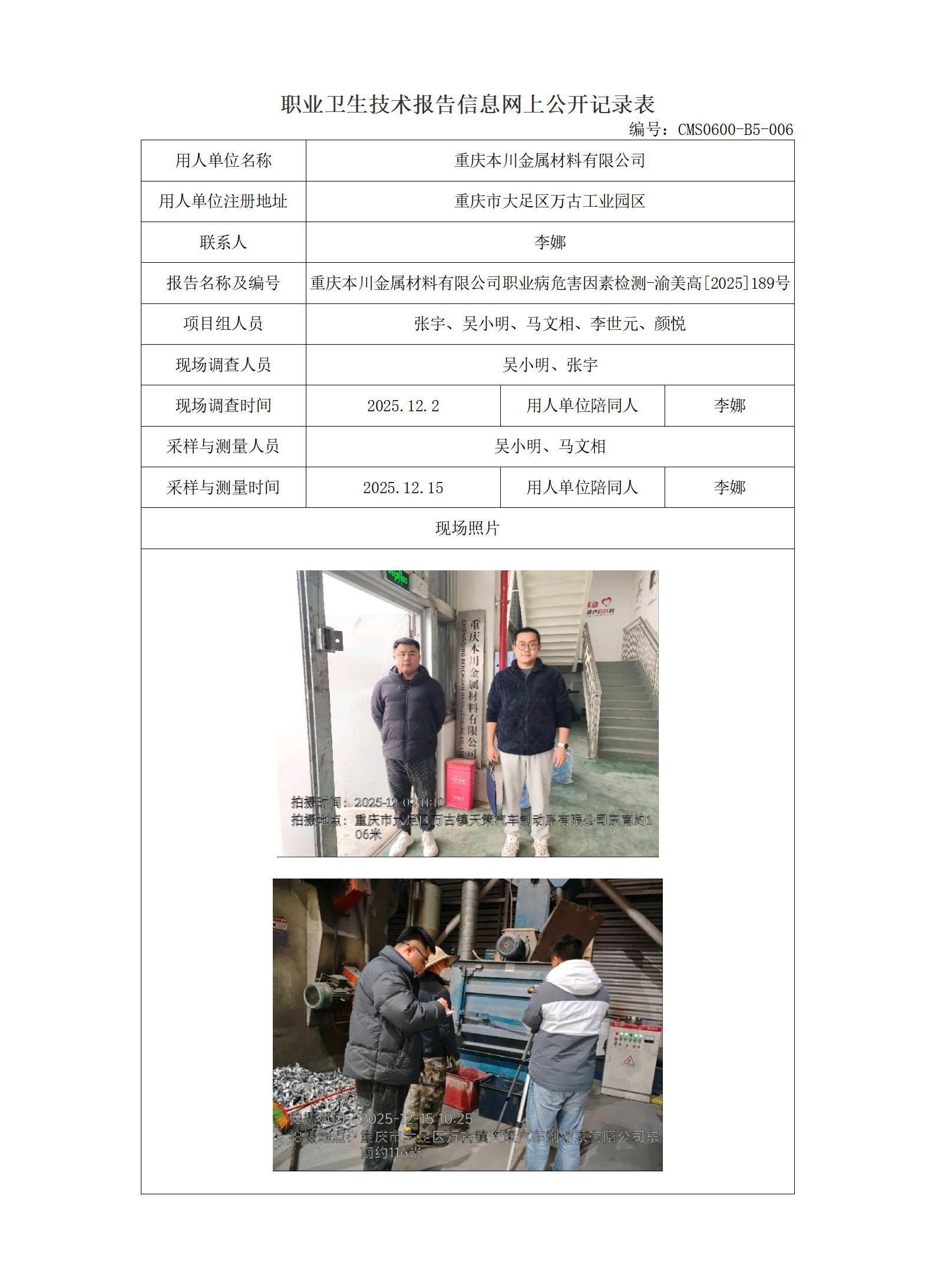 2025年-重庆本川金属材料有限公司职业病危害因素检测