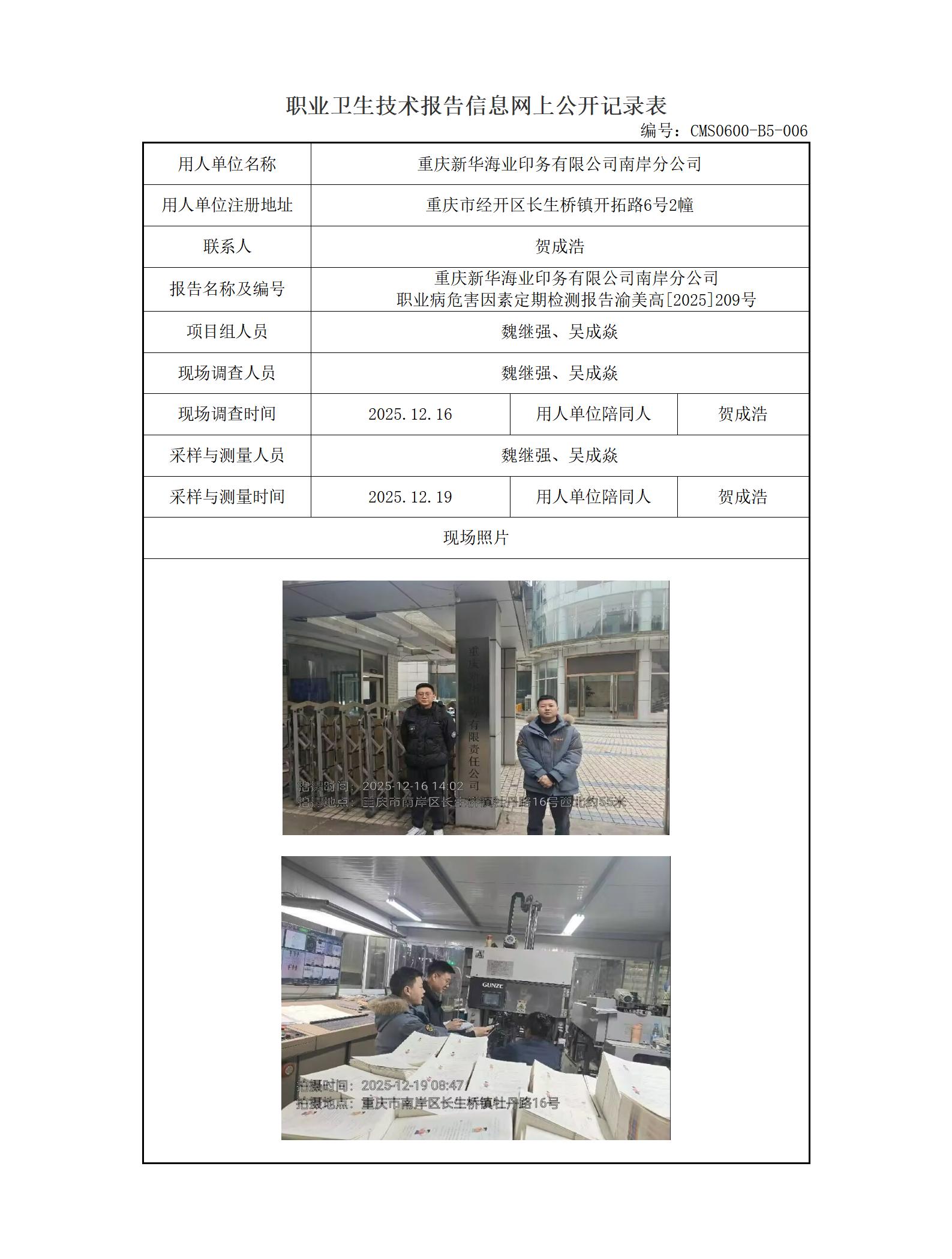 2025年-重庆新华海业印务有限公司南岸分公司职业病危害因素检测