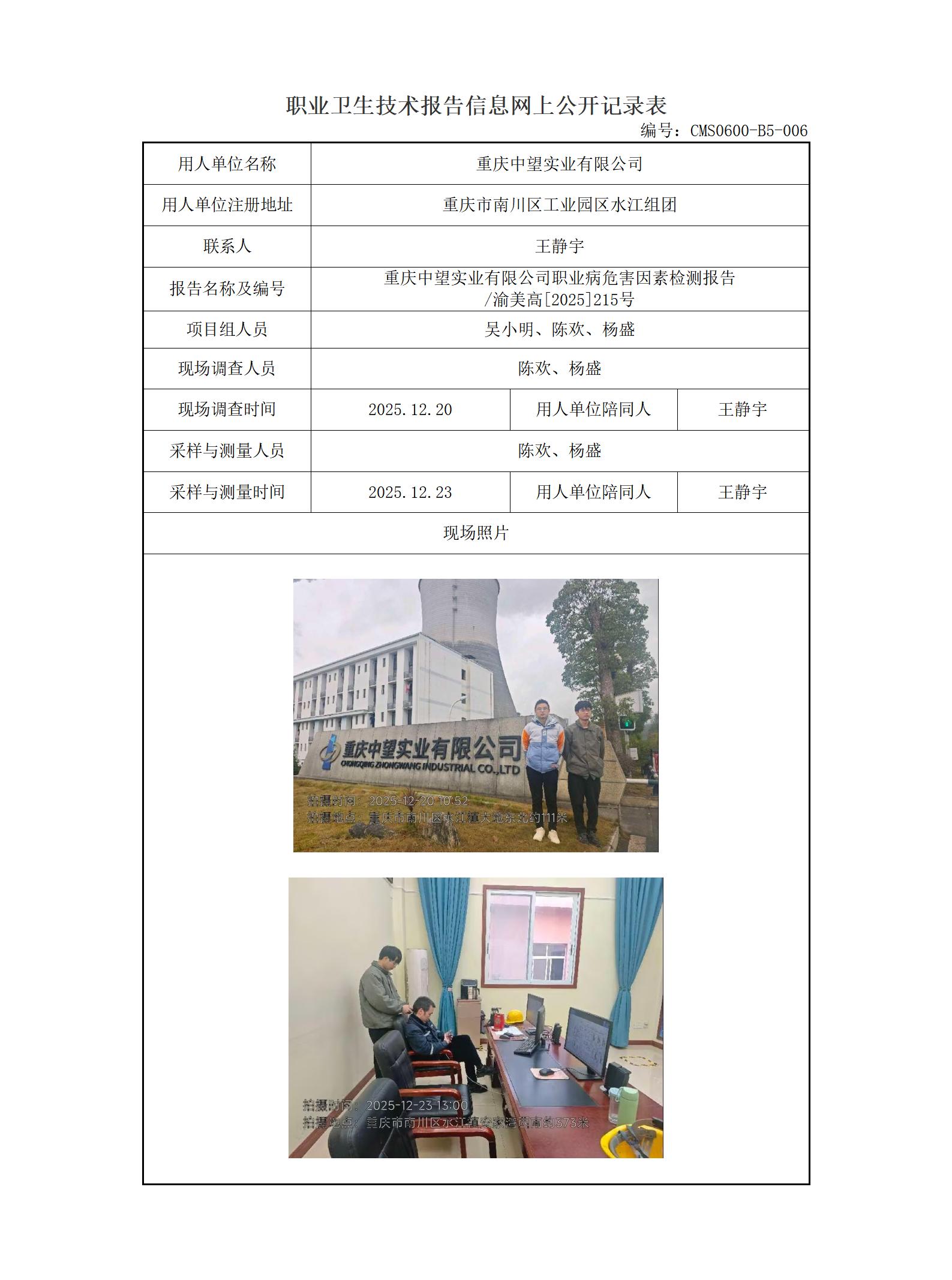 2025年-重庆中望实业有限公司职业病危害因素检测