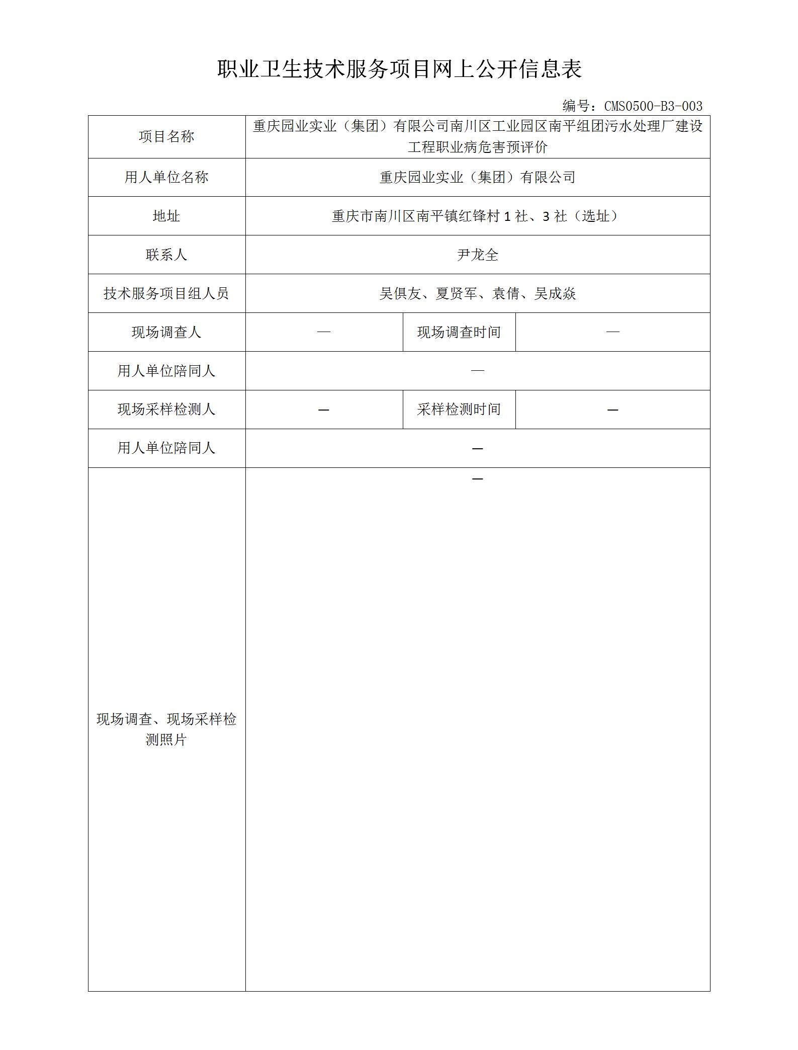 2022年-重庆园业实业(集团)有限公司南川区工业园区南平组团污水处理厂建设工程职业病危害预评价