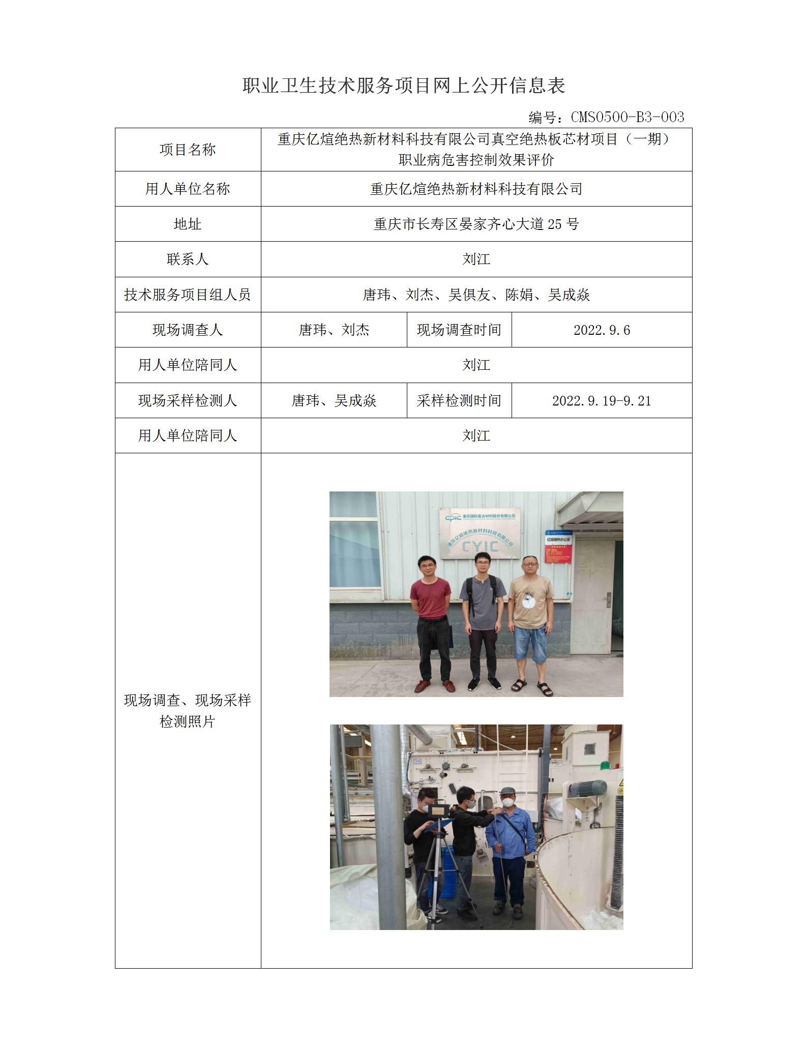 2023年-重庆亿煊绝热新材料科技有限公司真空绝热板芯材项目(一期)职业病危害控制效果评价