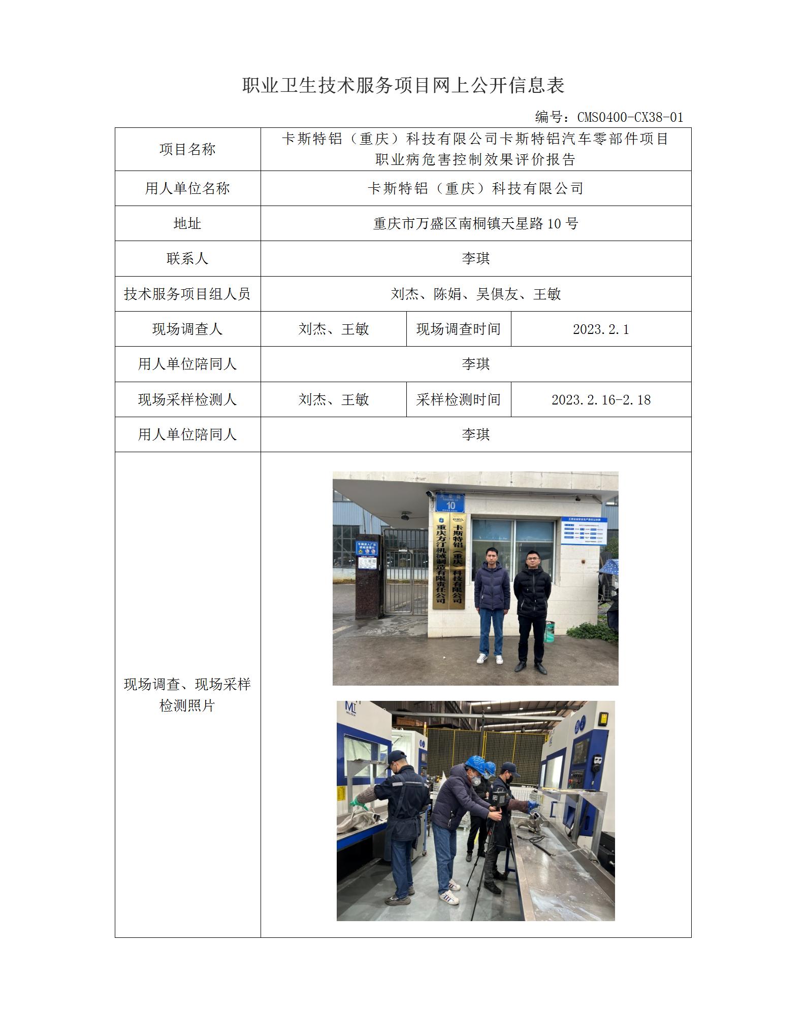 2023年-卡斯特铝(重庆)科技有限公司卡斯特铝汽车零部件项目职业病危害控制效果评价
