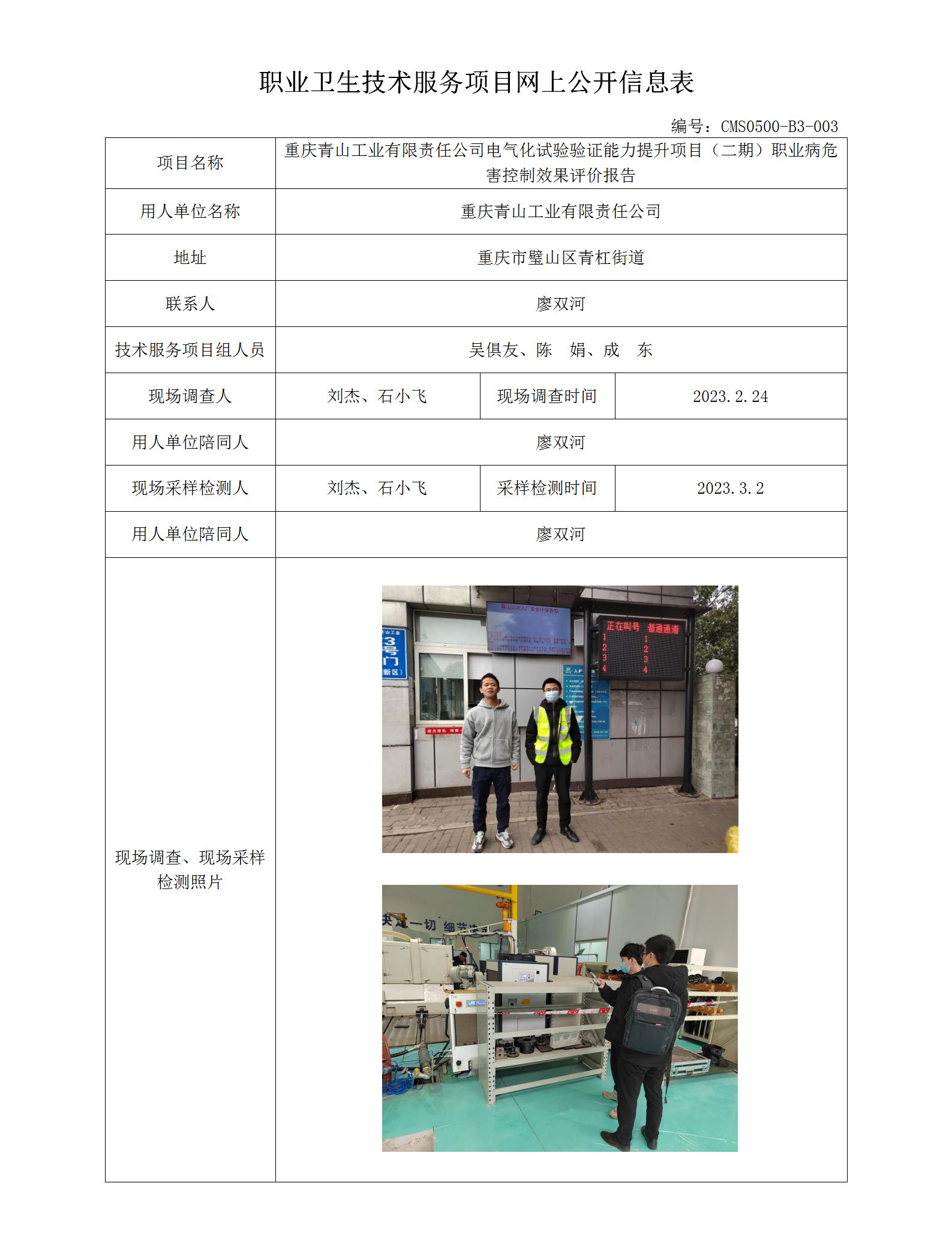 2023年-重庆青山工业有限责任公司电气化试验验证能力提升项目(二期)职业病危害控制效果评价