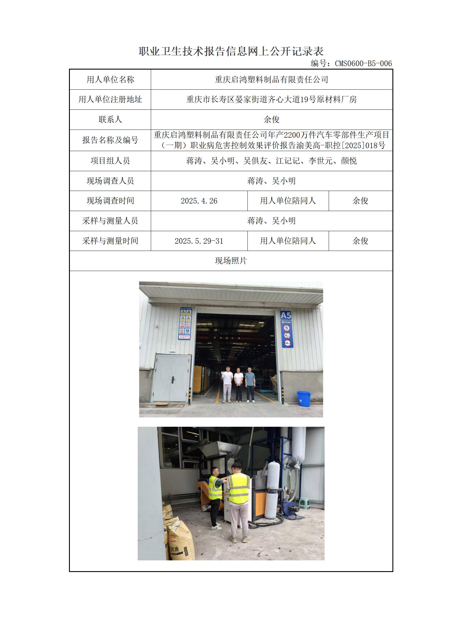 2025年-重庆启鸿塑料制品有限责任公司年产2200万件汽车零部件生产项目(一期)职业病危害控制效果评价
